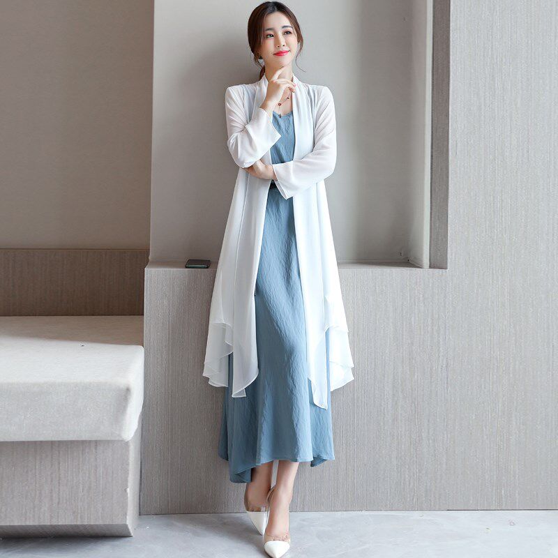 雪纺小披肩配裙子夏季新外搭开衫女中长款大码防晒衣连衣裙两件套