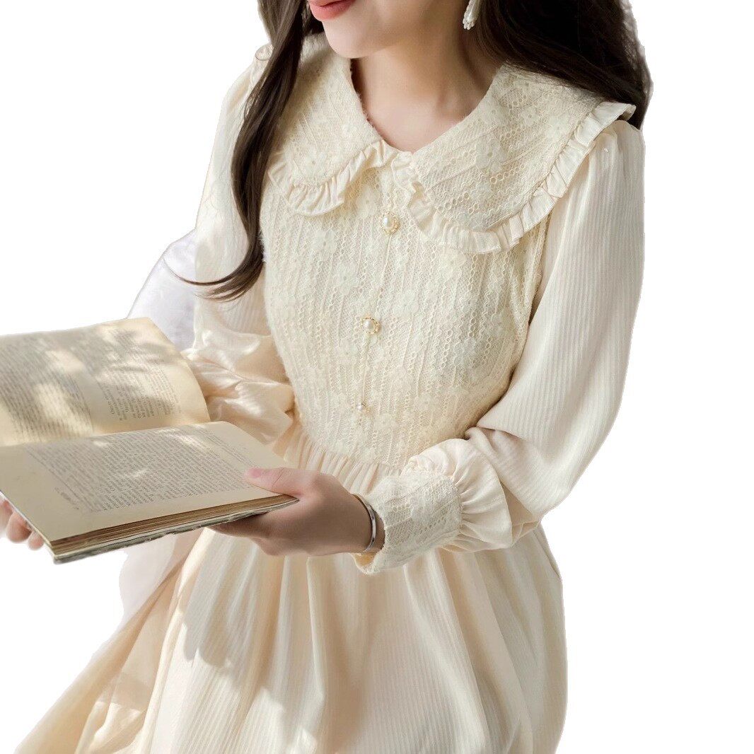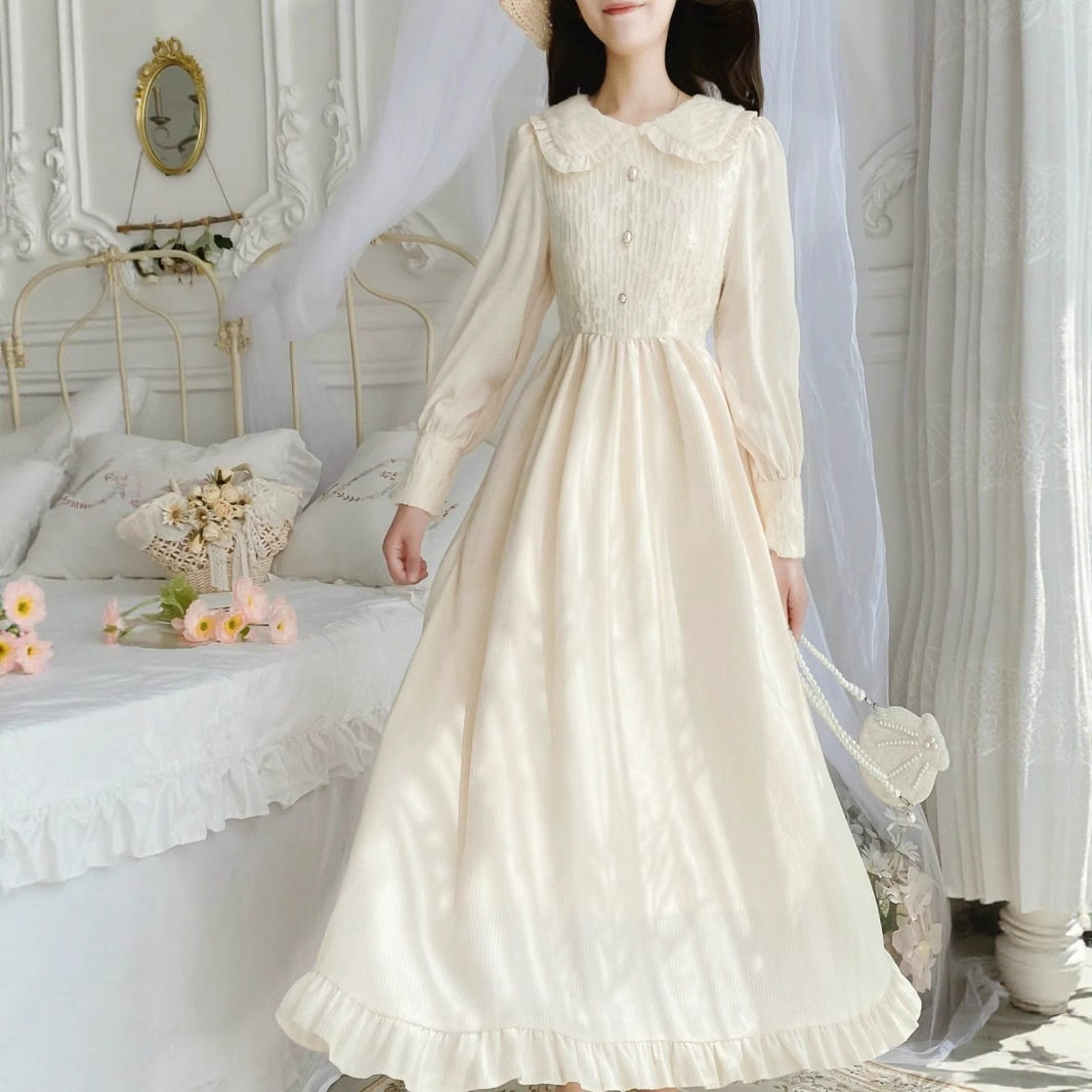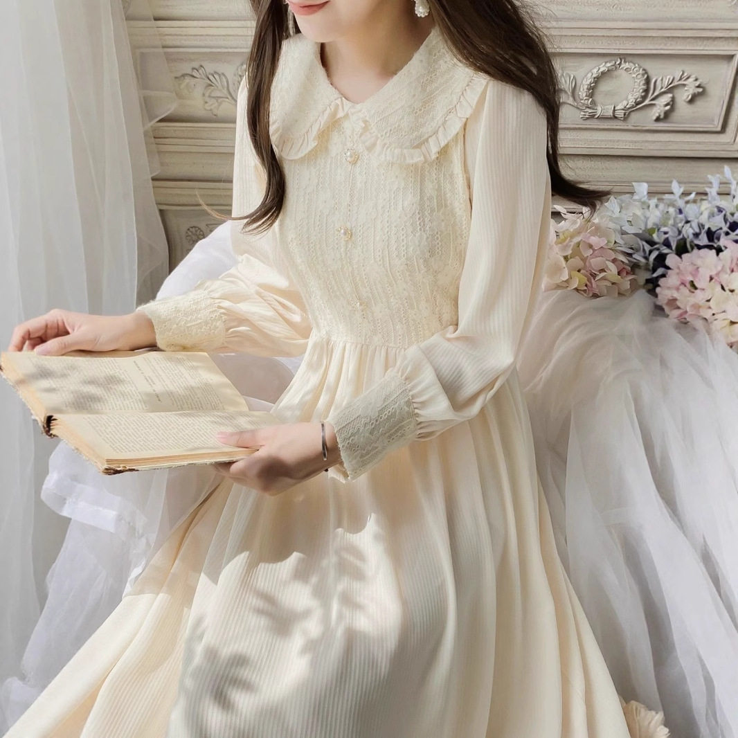 法式娃娃领长袖连衣裙女秋装新款温柔初恋收腰小个子气质长裙