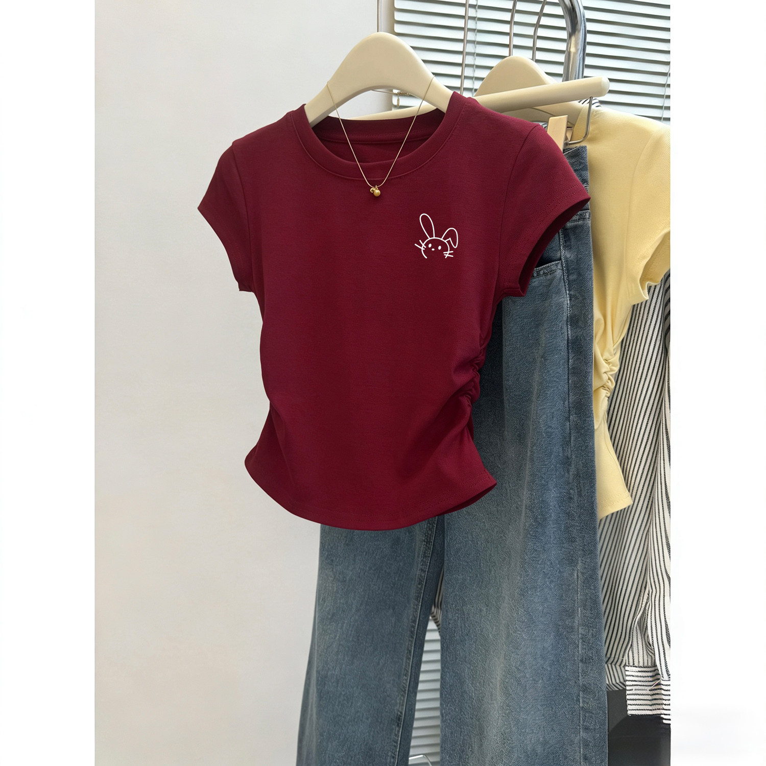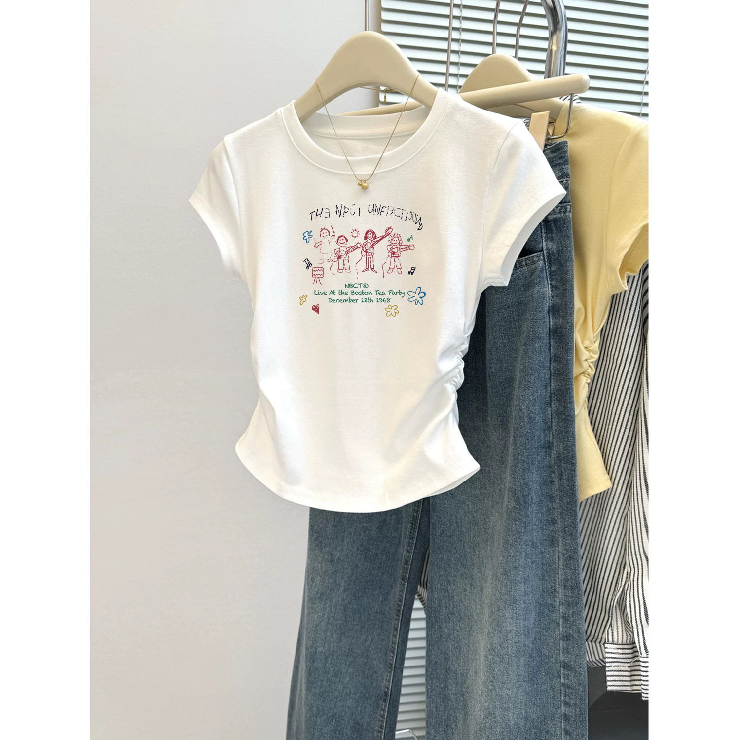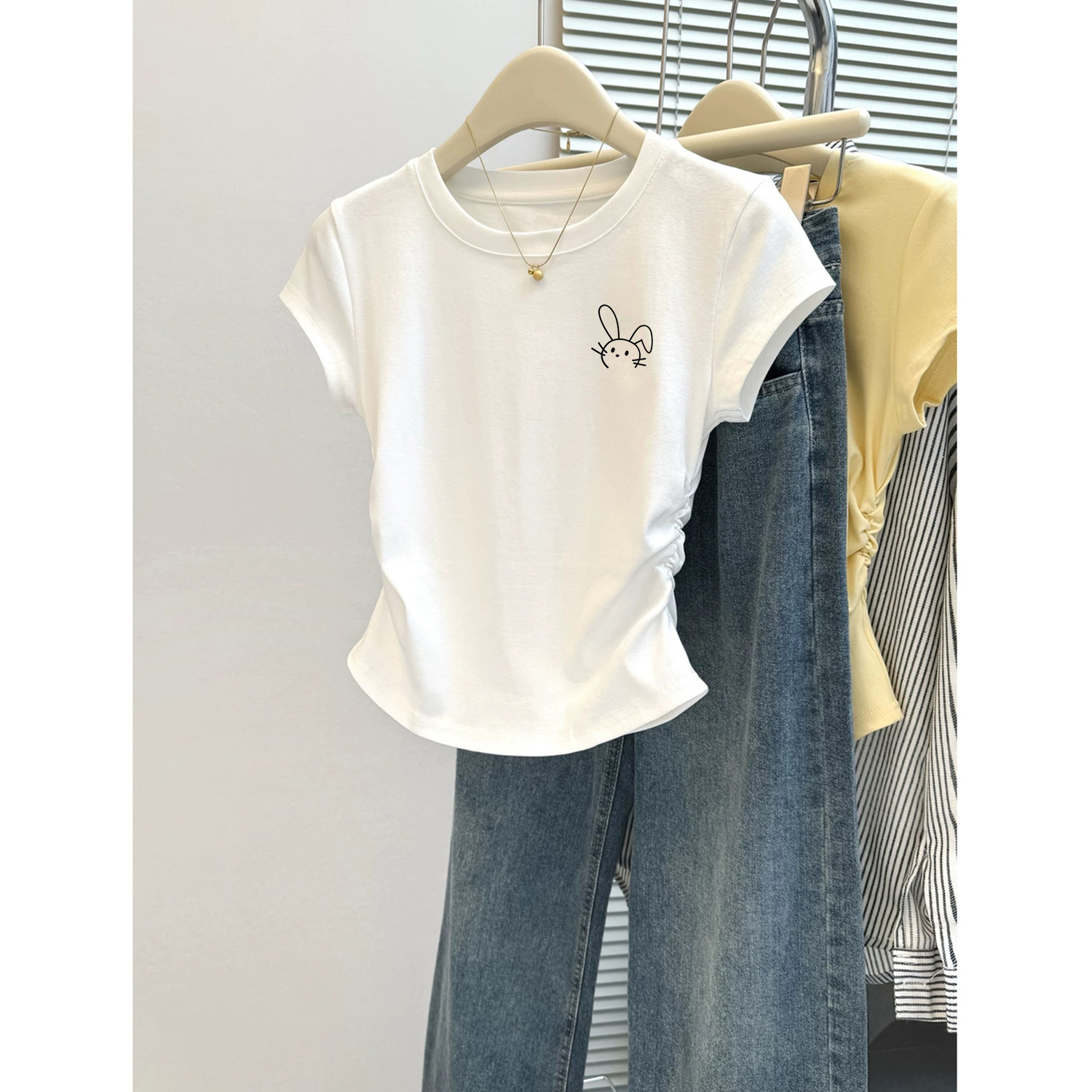 女童圆领夏装2026新款纯棉短袖T恤儿童白色修身短款掐腰上衣洋气