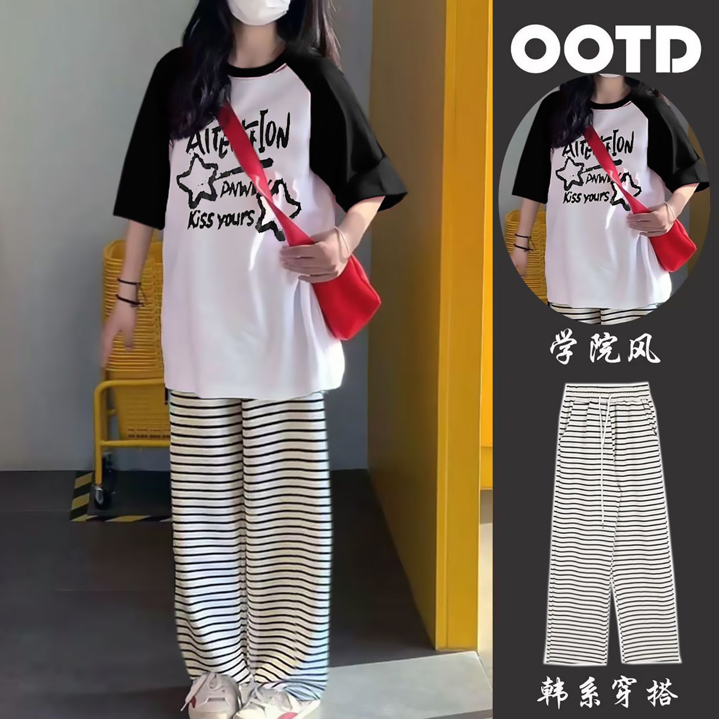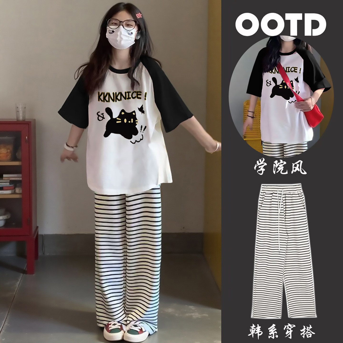 少女初中生套装女2026新款插肩t恤女夏短袖宽松阔腿裤薄款条纹裤