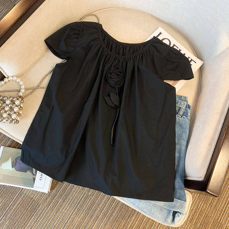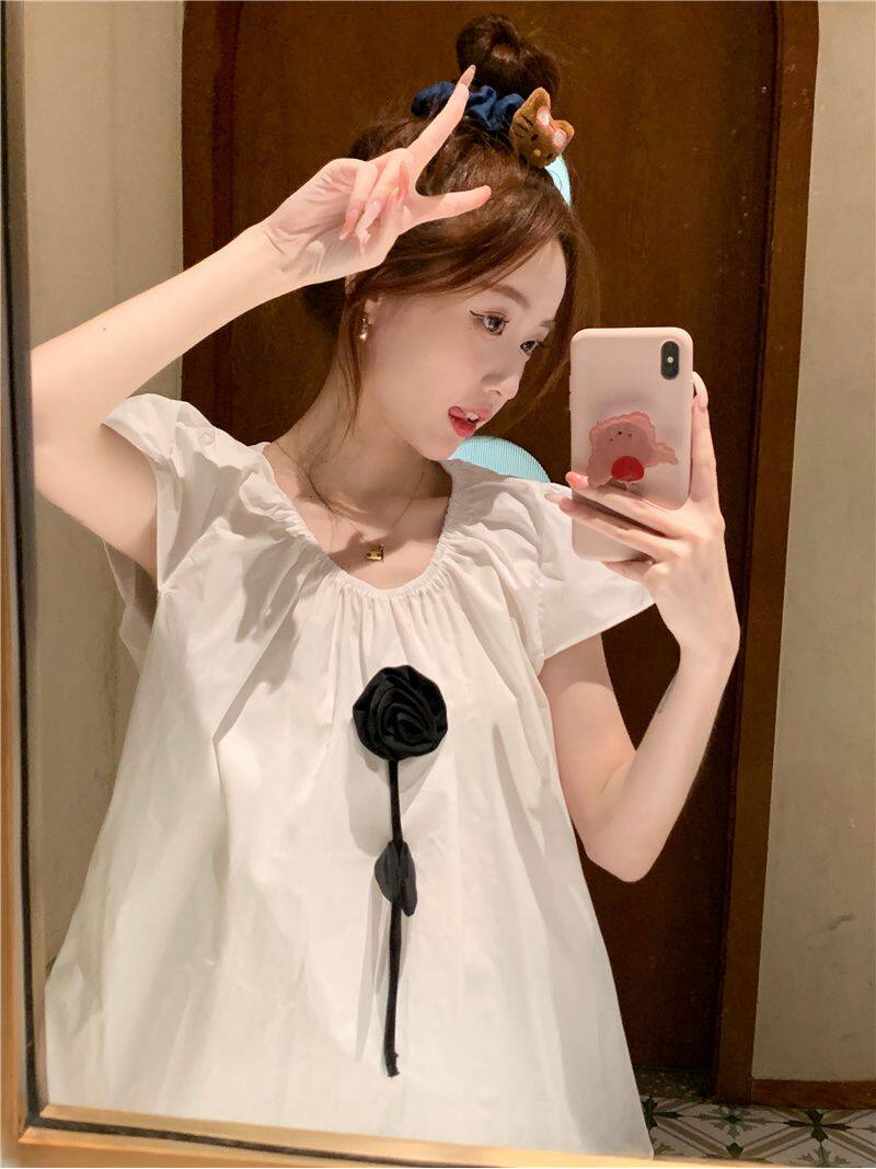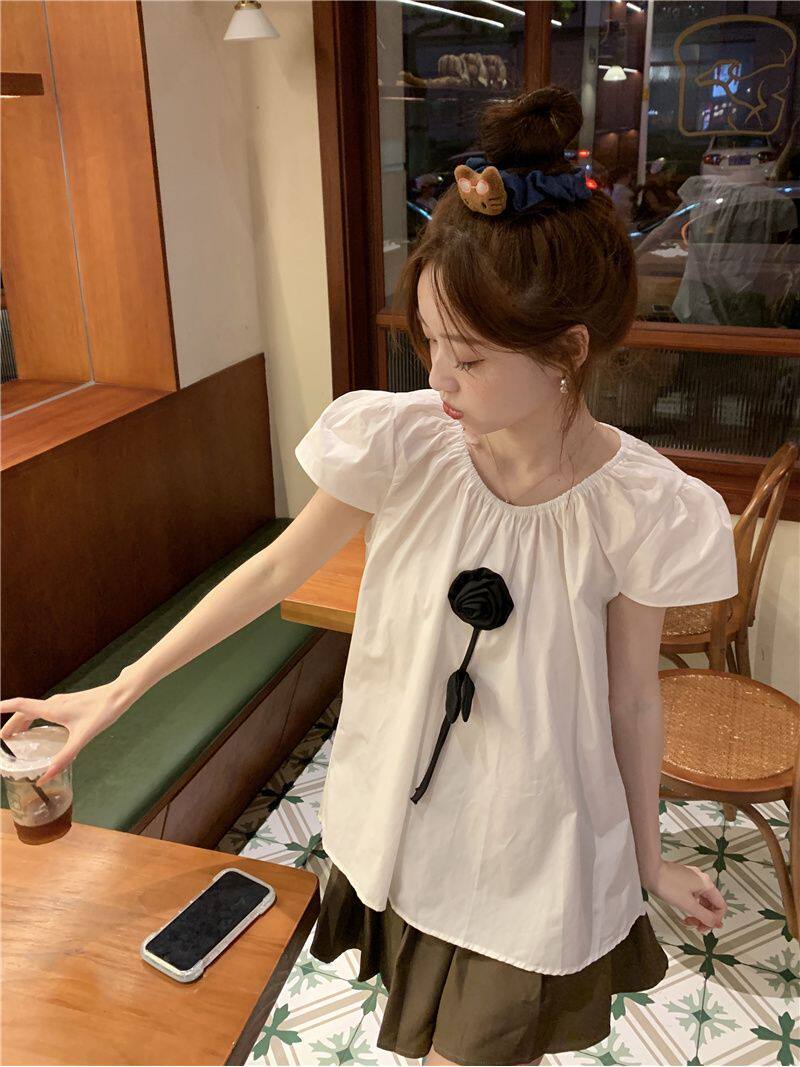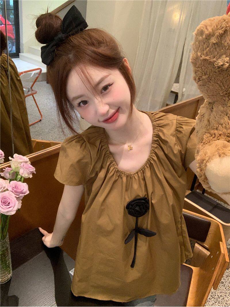 2026夏季新款法式文艺复古圆领泡泡袖宽松套头短袖衬衫衬衣上衣女