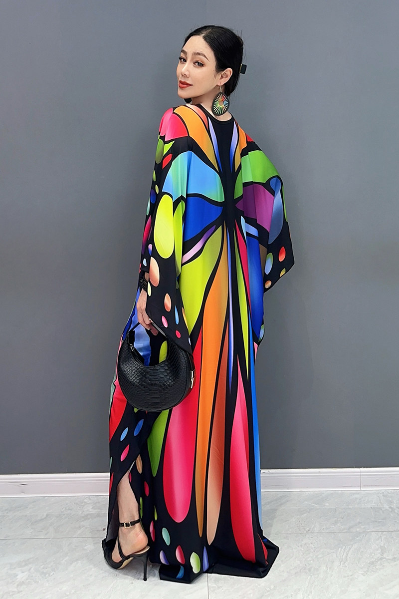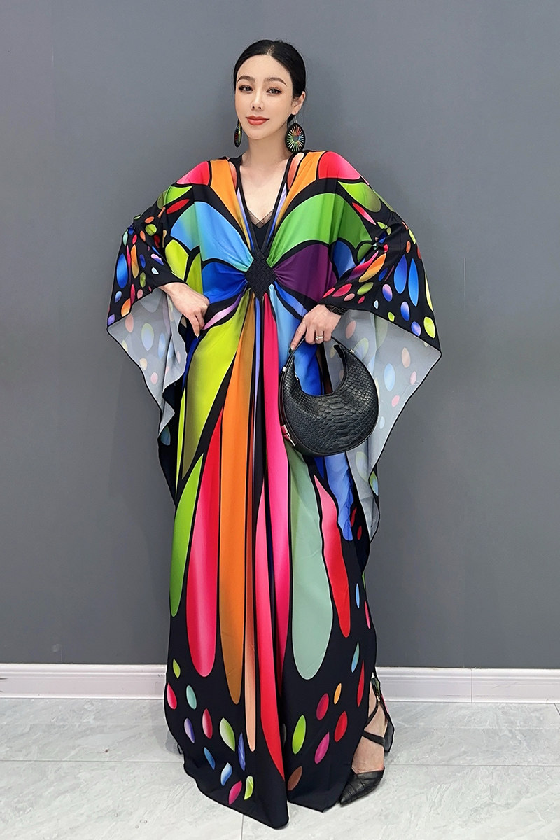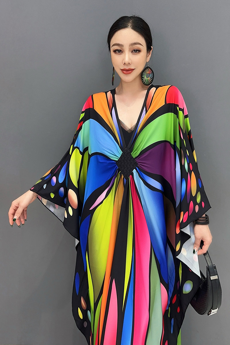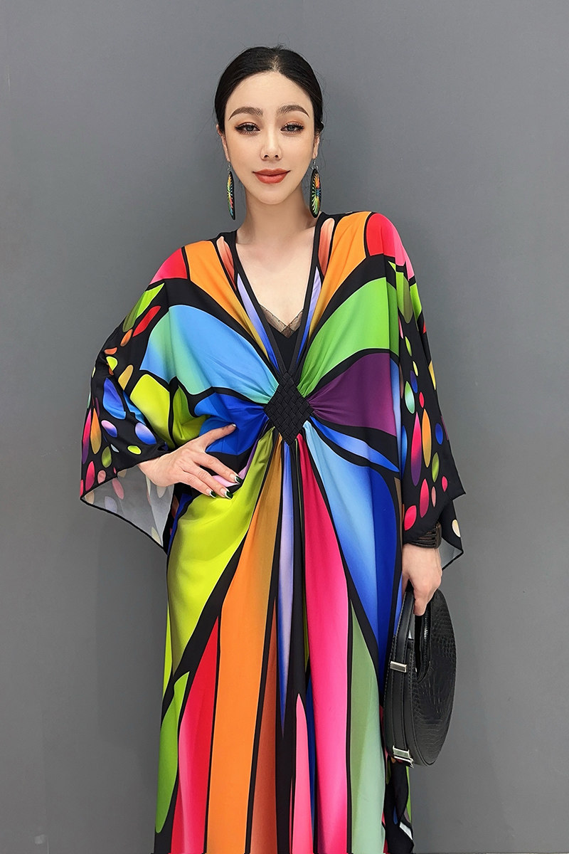 2026春季新款女士连衣裙印花蝙蝠袖V领长裙宽松大码休闲时尚优雅