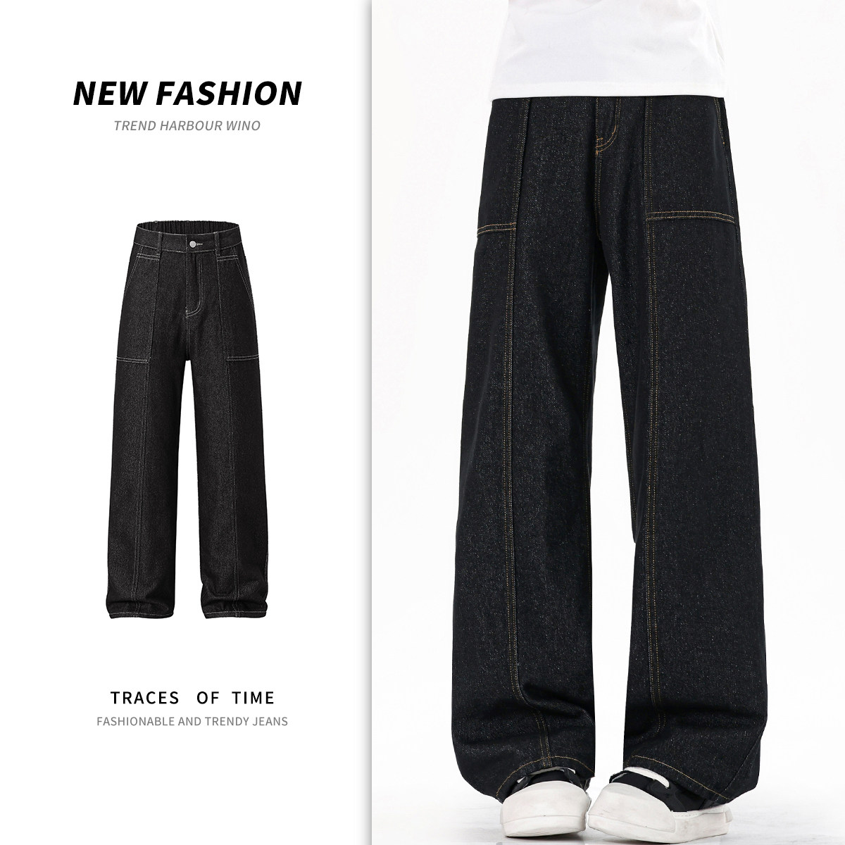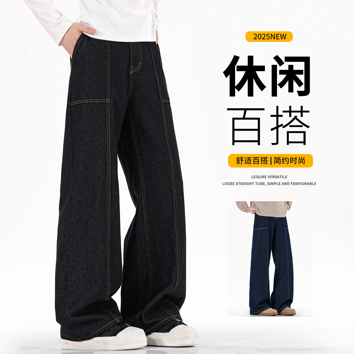 牛仔裤男生春季潮流拼接休闲裤潮牌宽松直筒裤子男女款百搭长裤