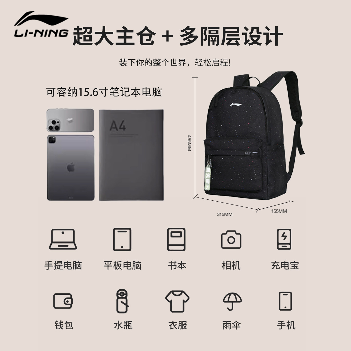 李宁满天星双肩包初中生高中生大容量学生书包运动通勤大学生背包