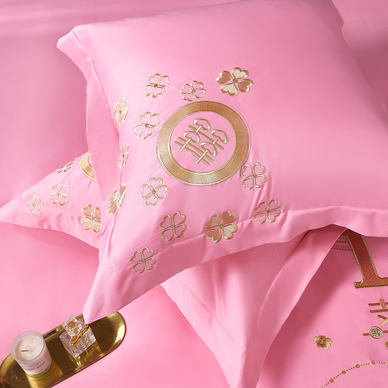 120支真丝四件套结婚刺绣粉色轻奢婚庆床上用品冰丝裸睡床单夏款