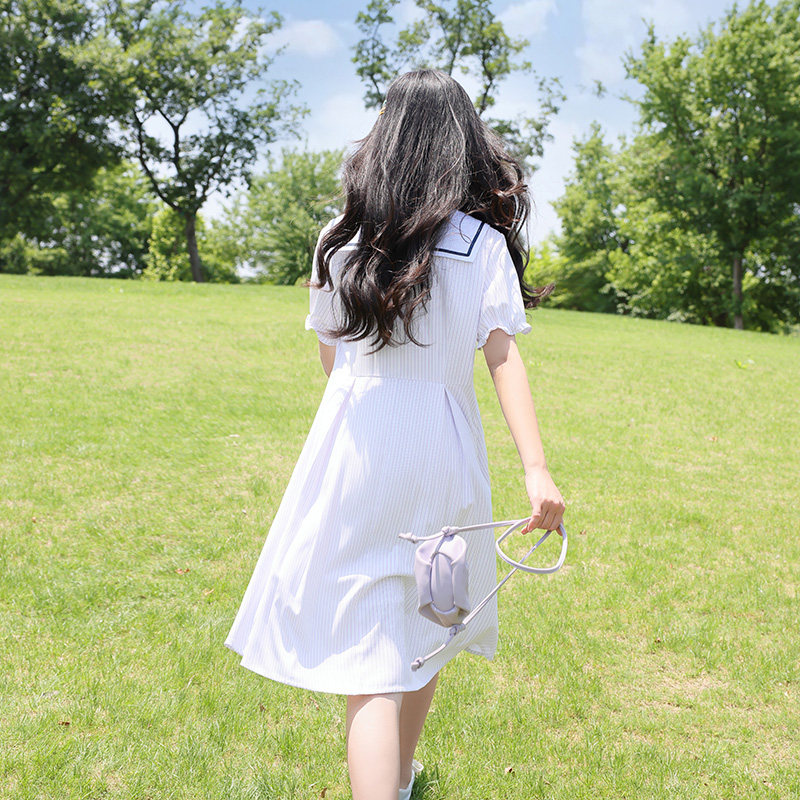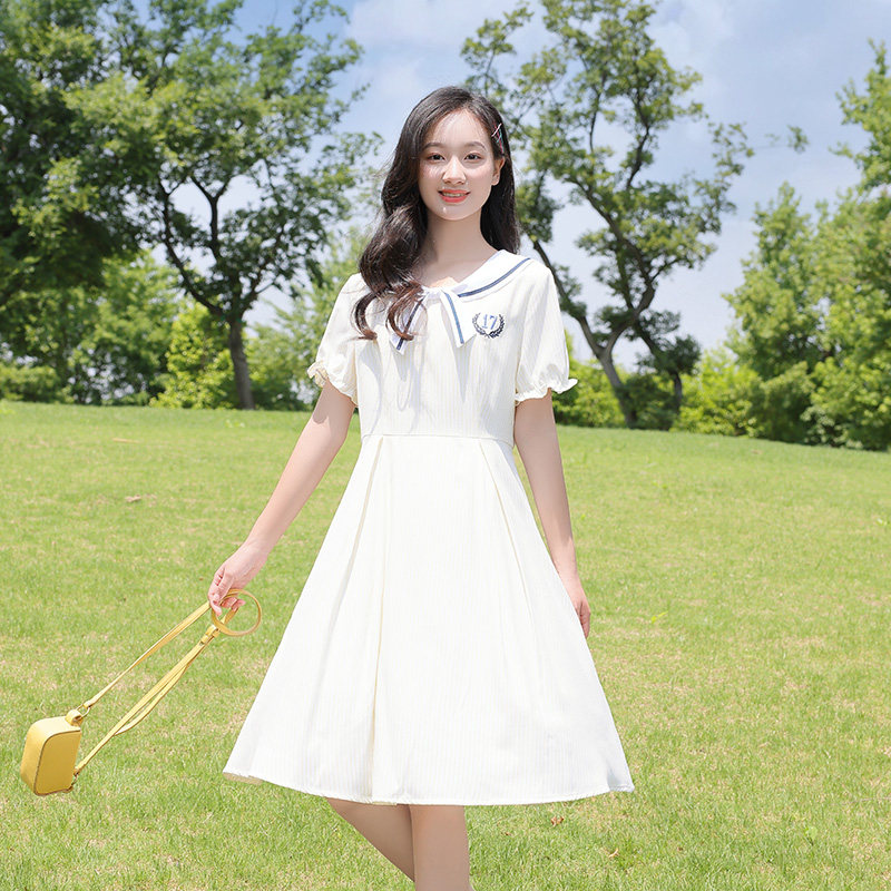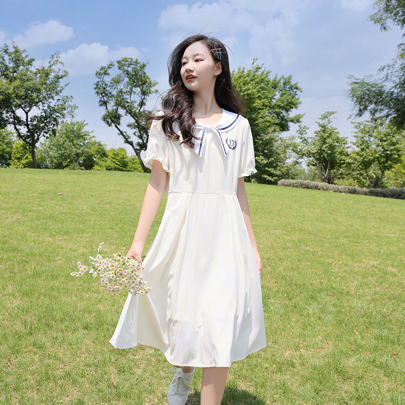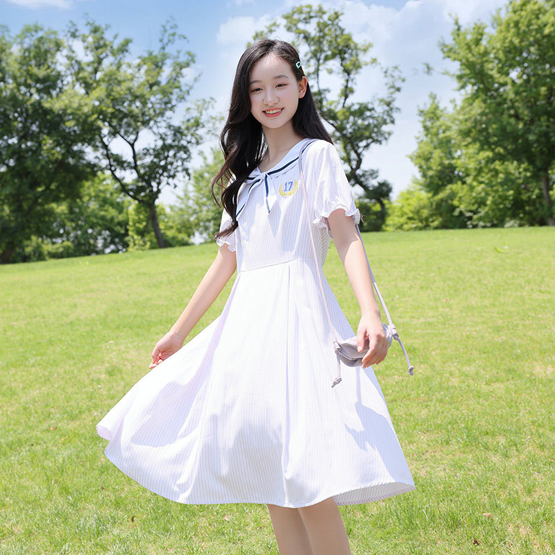 初中生连衣裙少女学生裙竖条纹日系学院风高中生过膝裙子女中长款