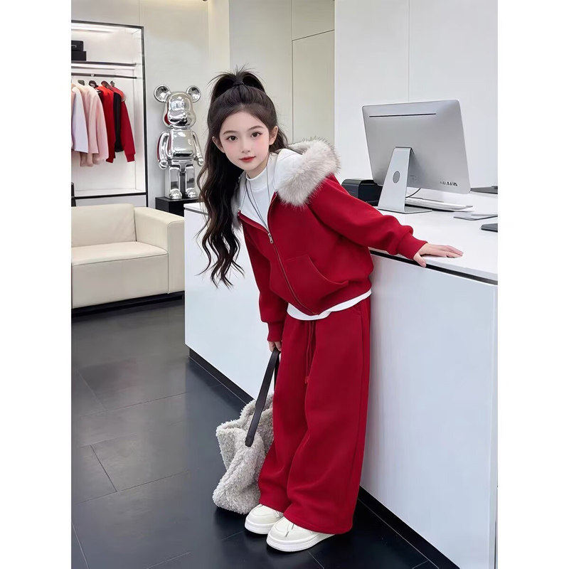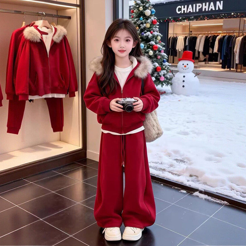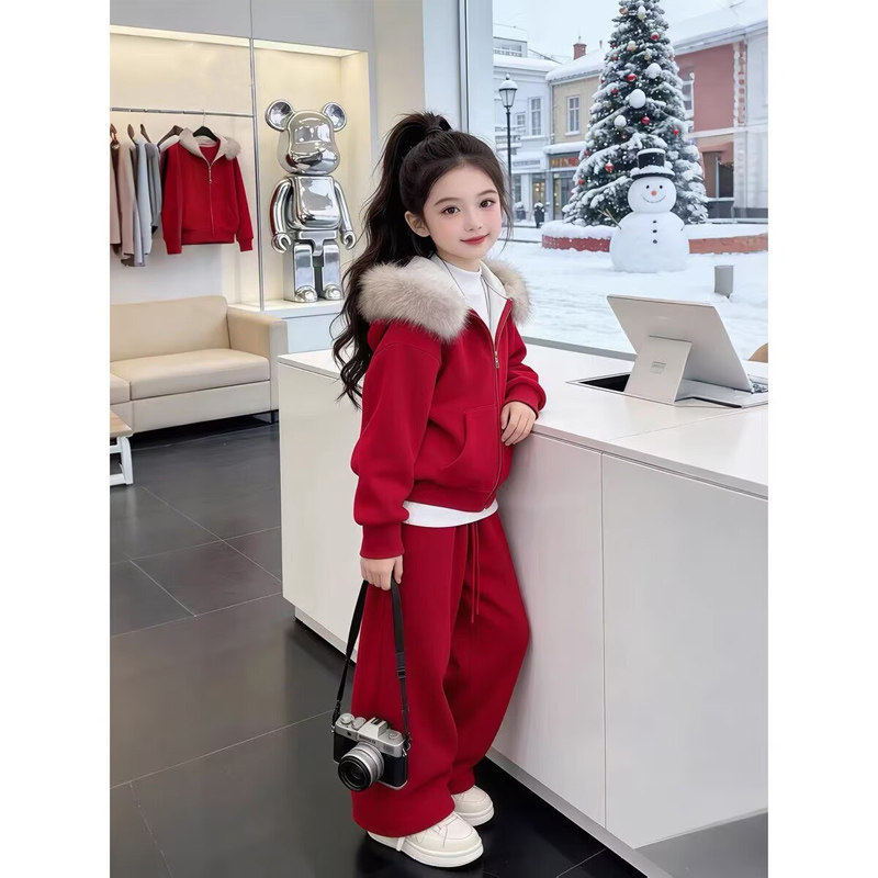 女童加绒运动套装秋冬季2026新款儿童冬装新年过年衣服女孩拜年服