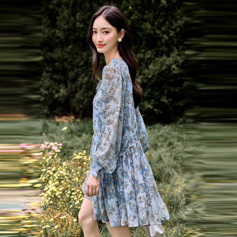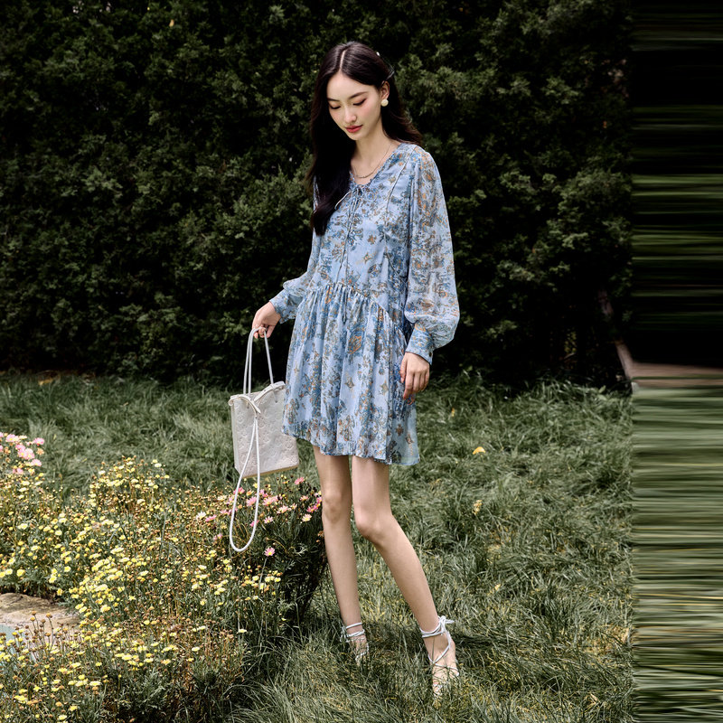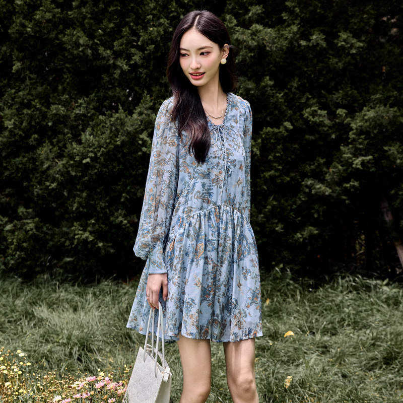 雪歌2024秋季新款复古碎花短款宽松长袖V领连衣裙女XJ304008B197