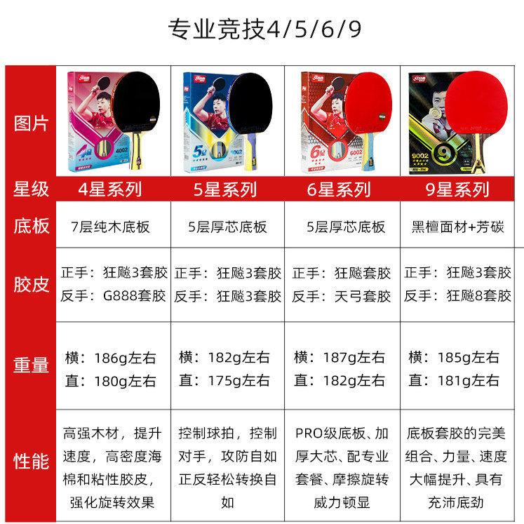 红双喜官方旗舰店 乒乓球拍九星级单拍狂飚9星专业级横拍直拍成品