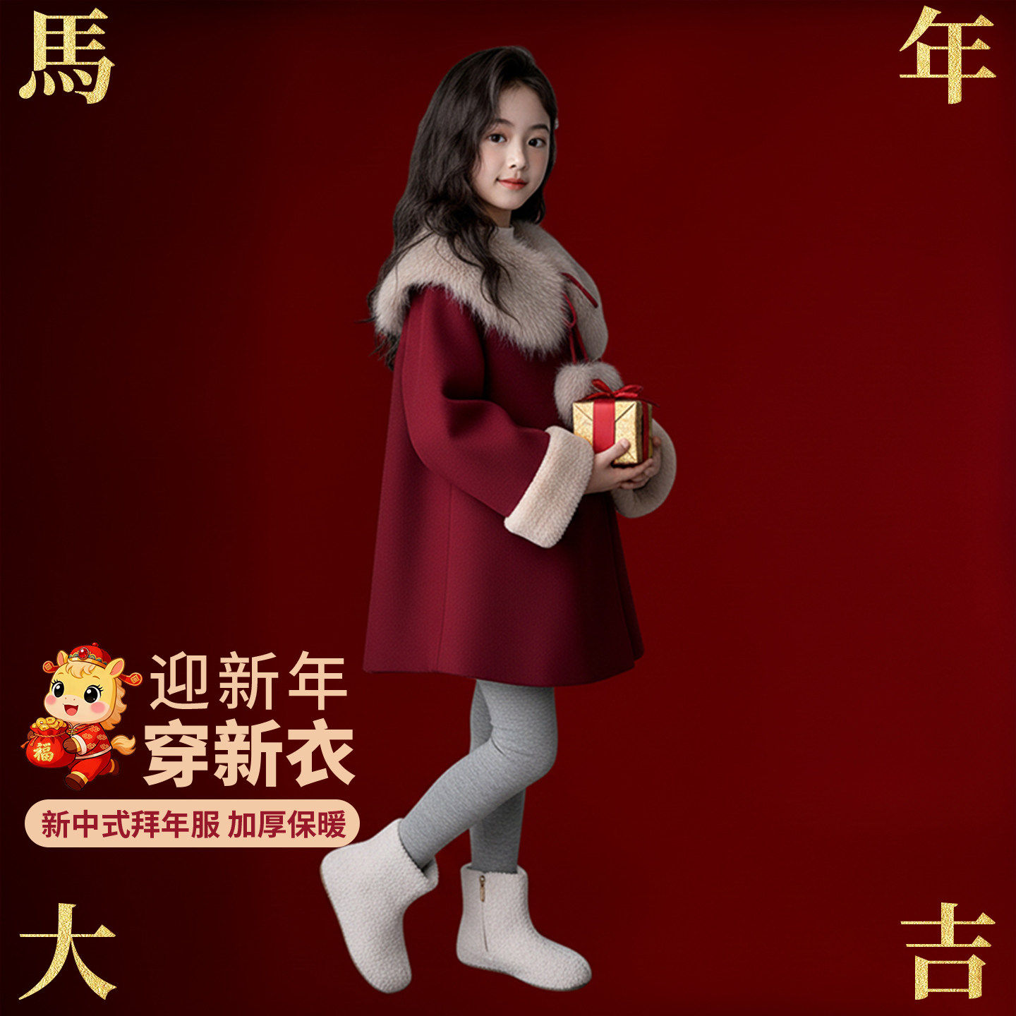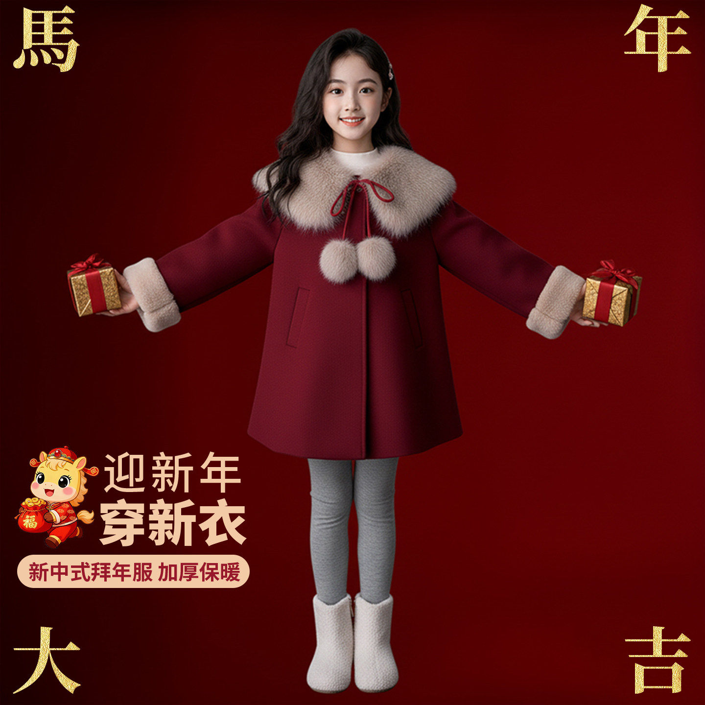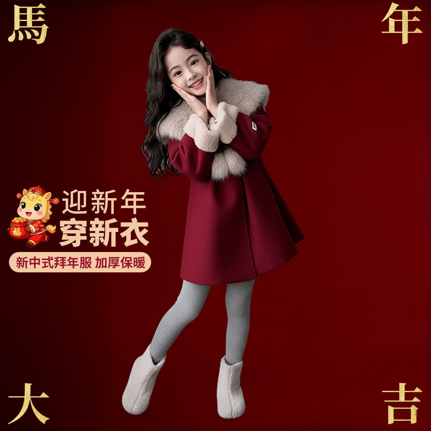 女童毛呢洋气外套冬2025新款女孩本命年中长款大衣儿童红色拜年服