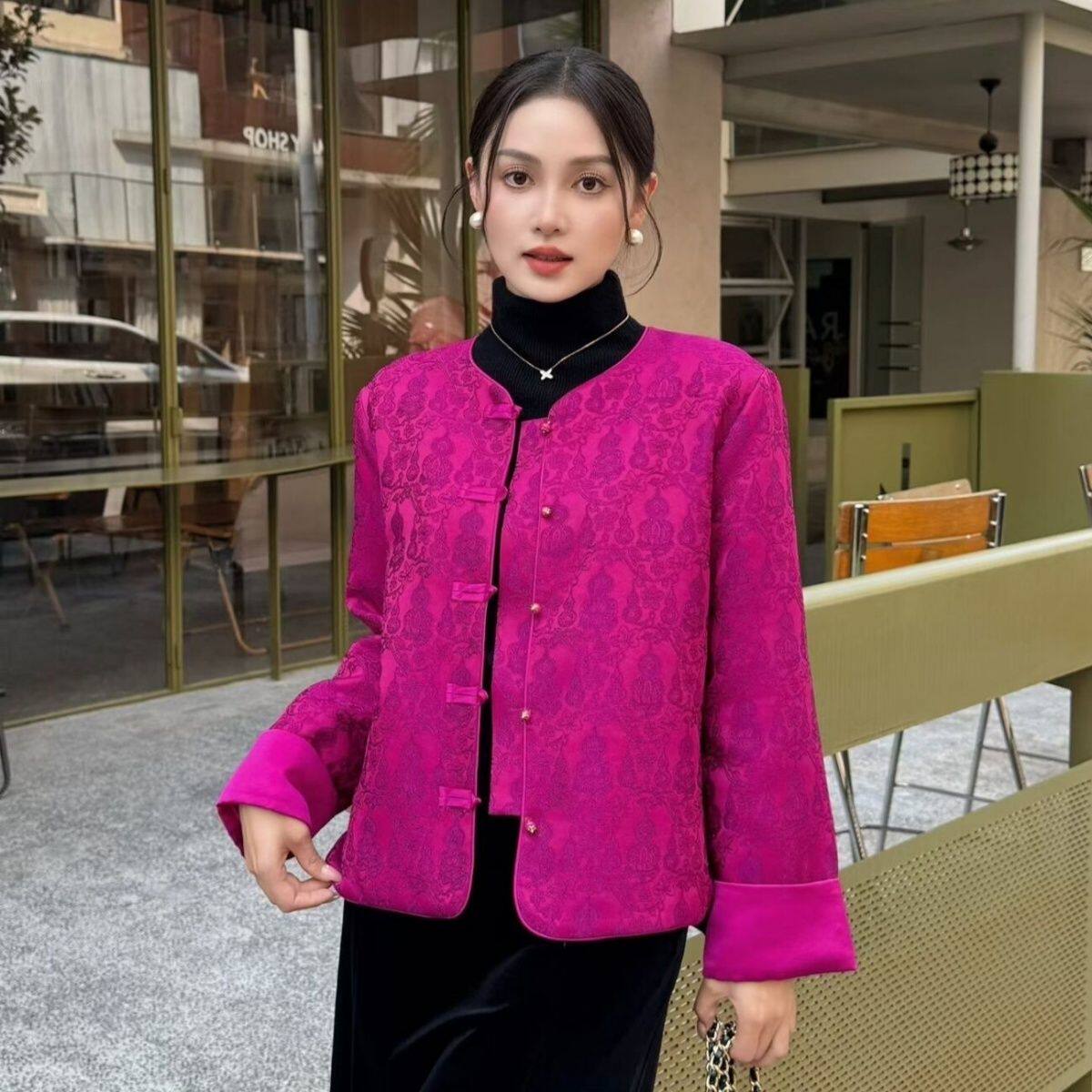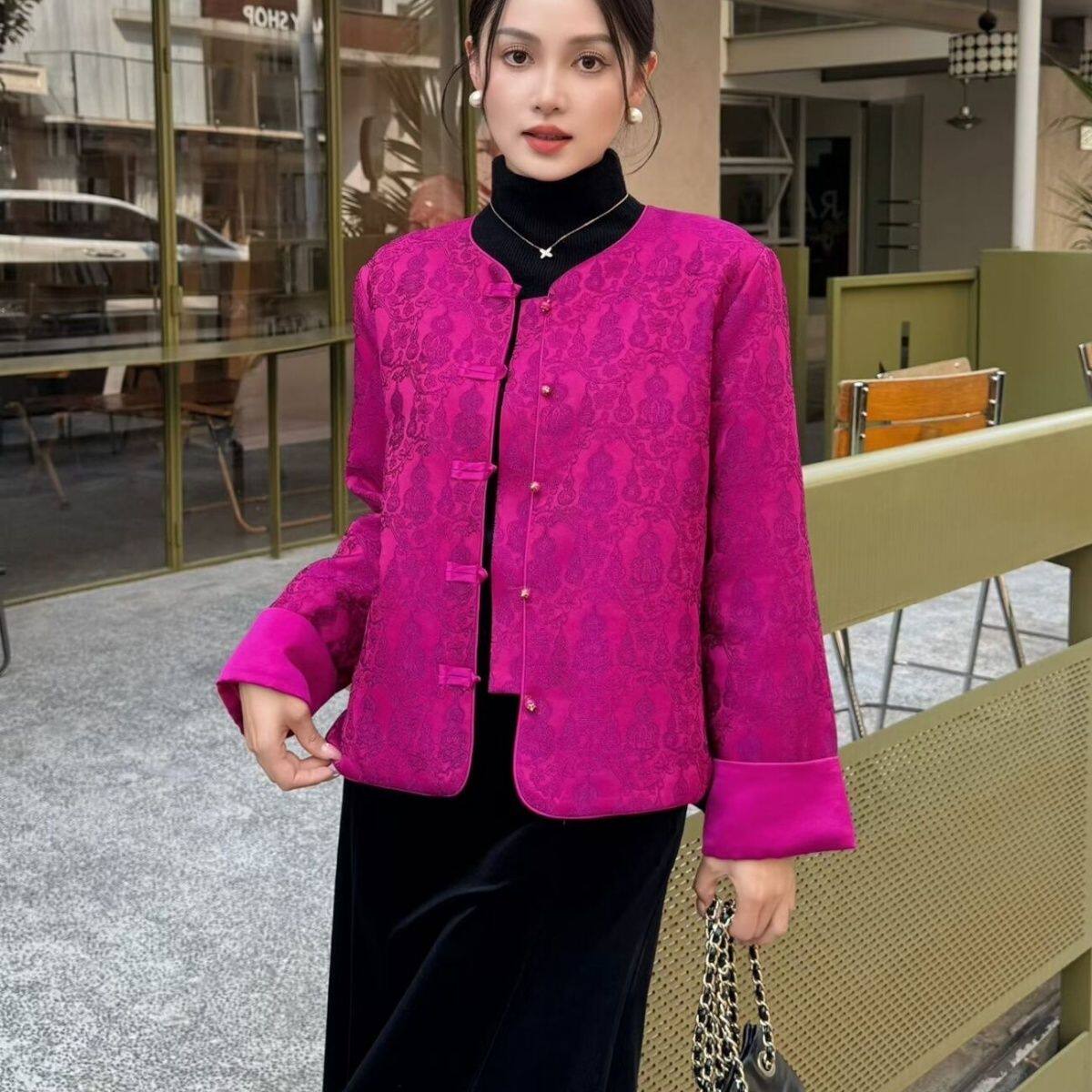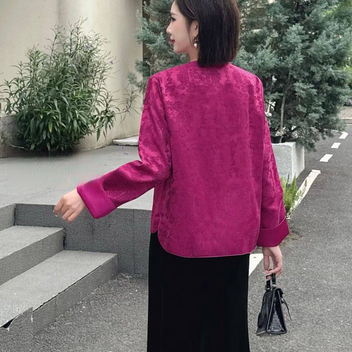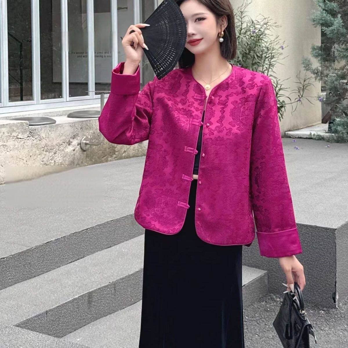 2026春季新款薄棉衣时尚提花新中式复古国风盘扣圆领加棉外套女