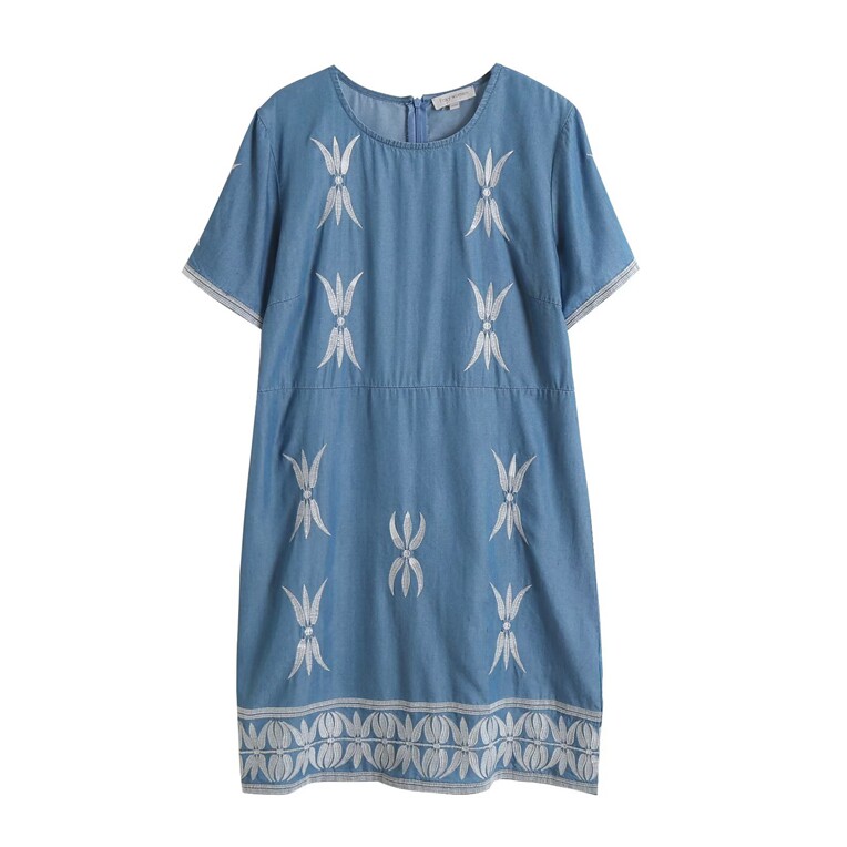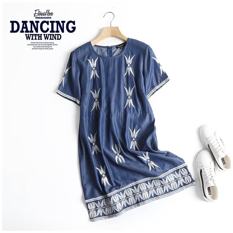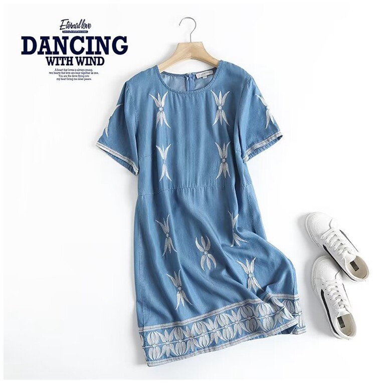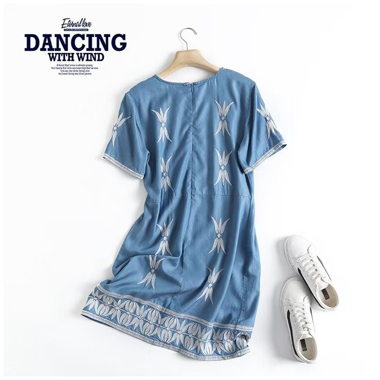 外贸女装2022夏季新款圆领刺绣天丝连衣裙薄款透气小个子牛仔短裙