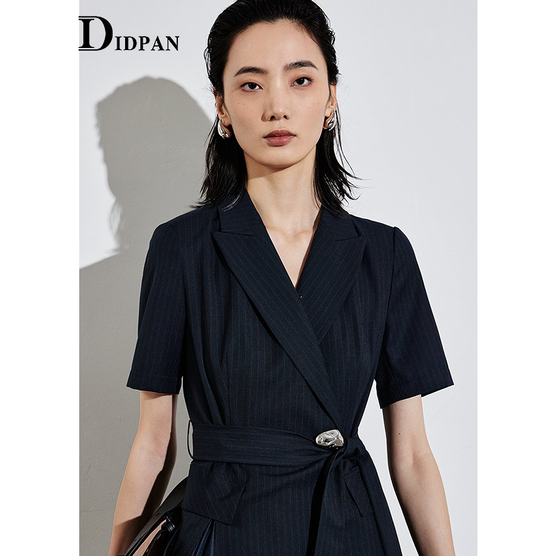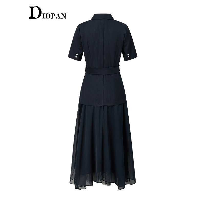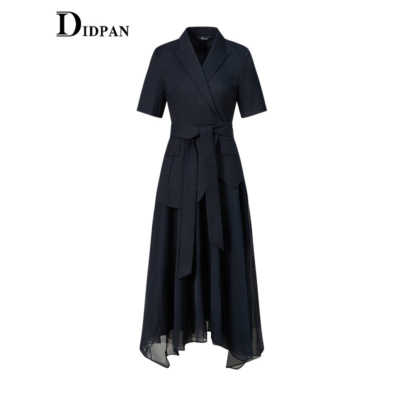IDPAN女装夏季新款职场通勤高级感气质西装领网纱拼接连衣裙