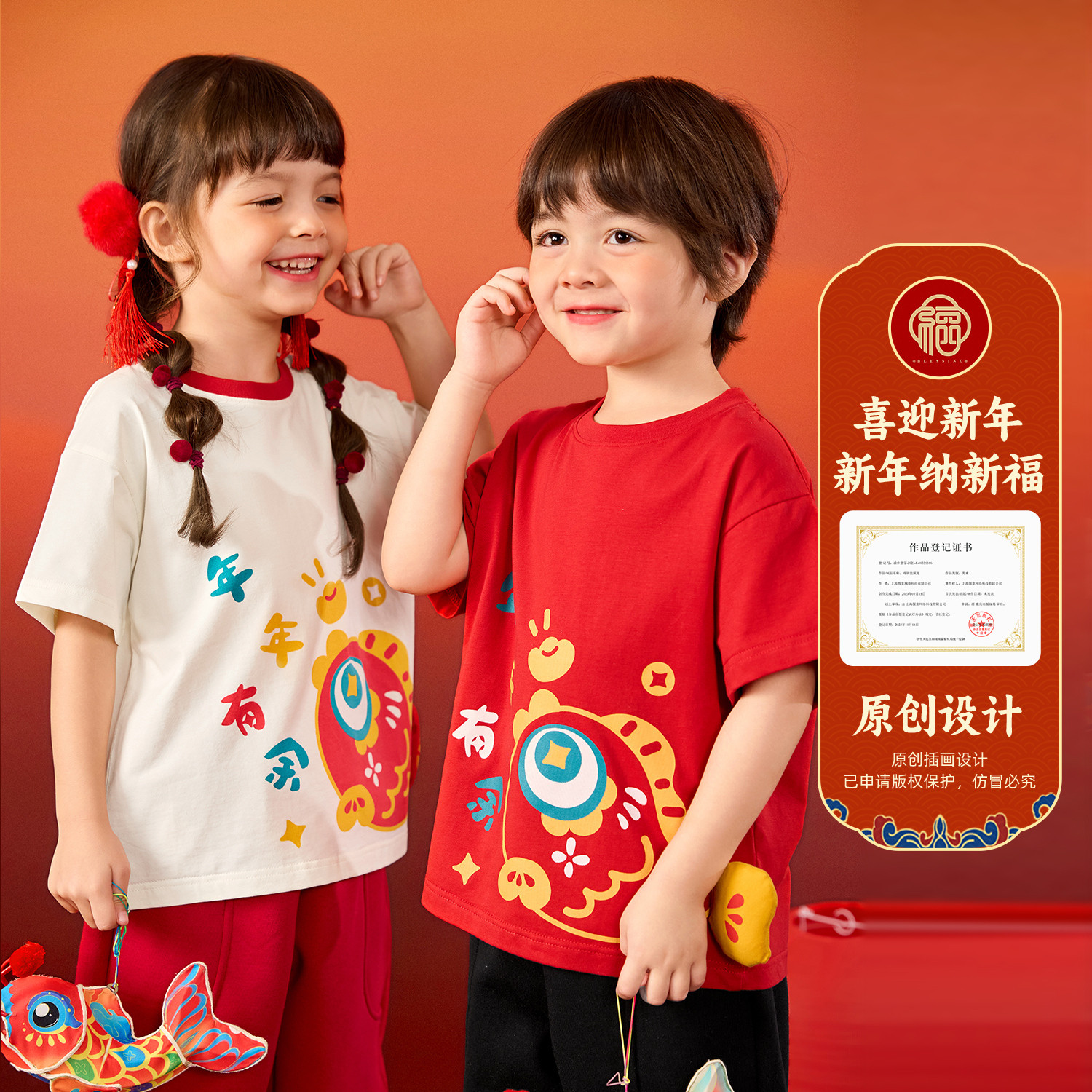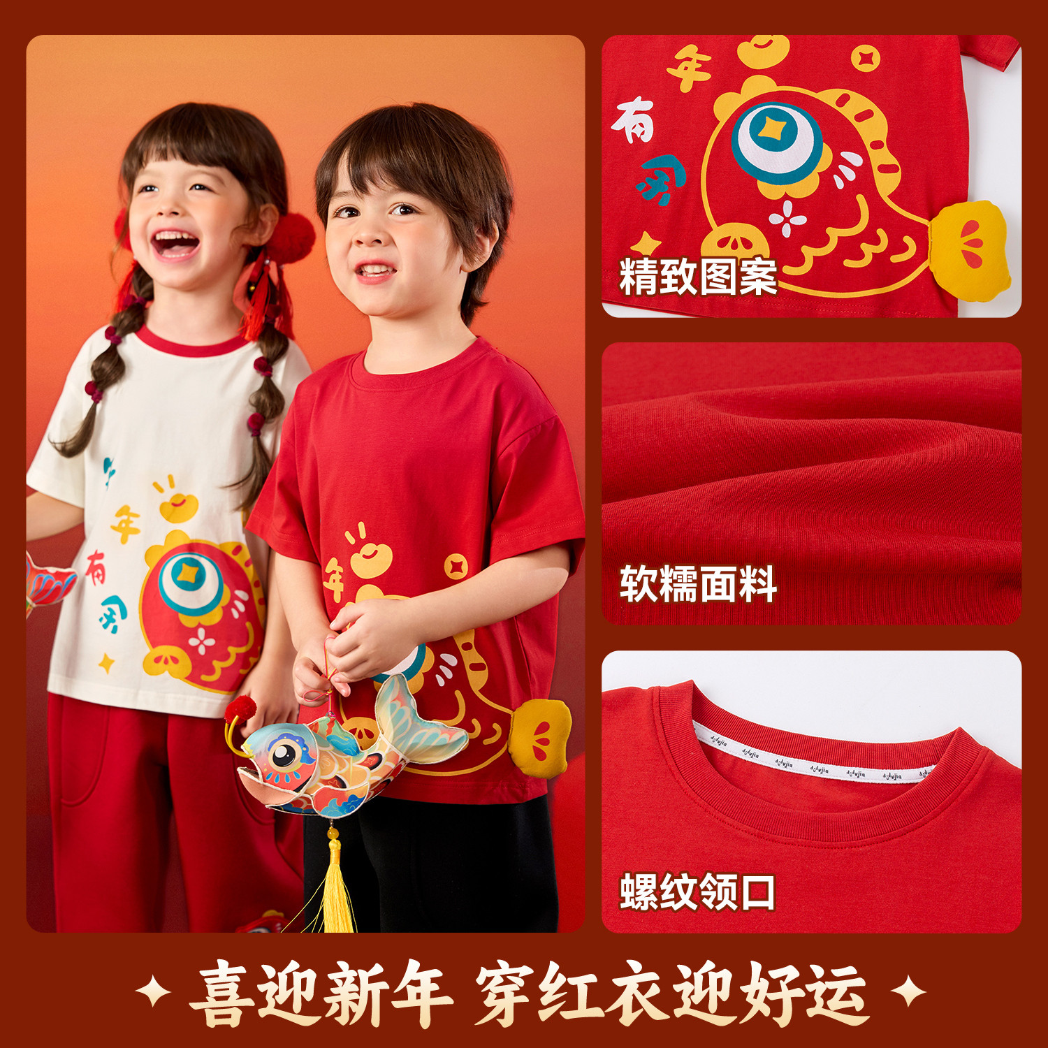 嘟嘟家儿童年装国风男童T恤红色短袖内搭t女童年服男宝上衣女宝冬