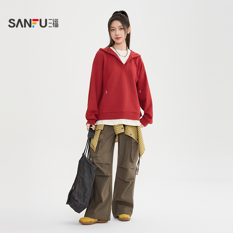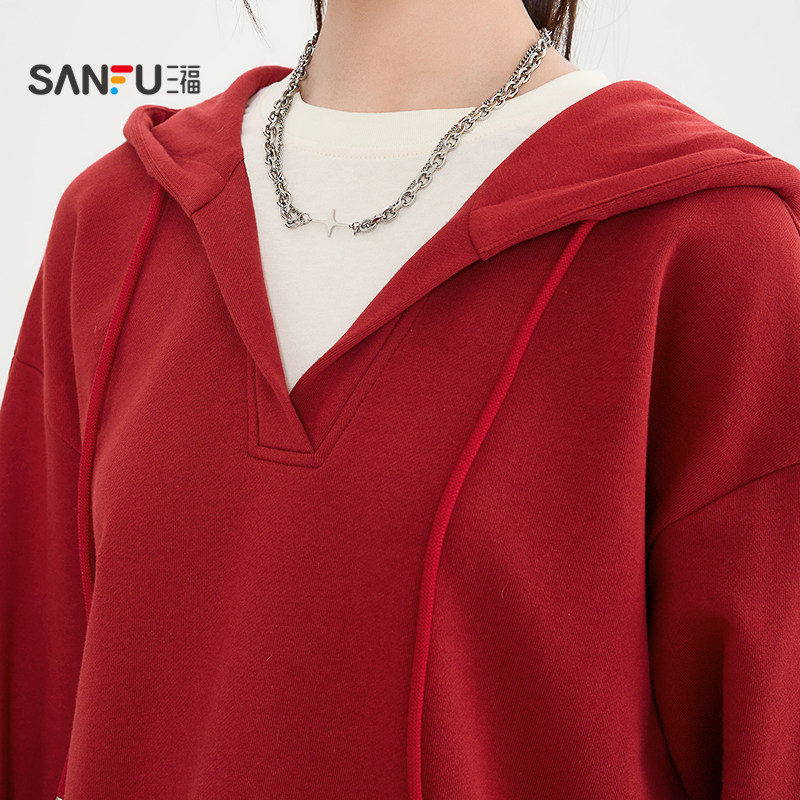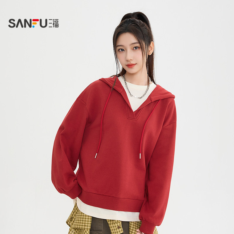 三福红色卫衣女2026新款春季设计感假两件宽松连帽上衣女装517389