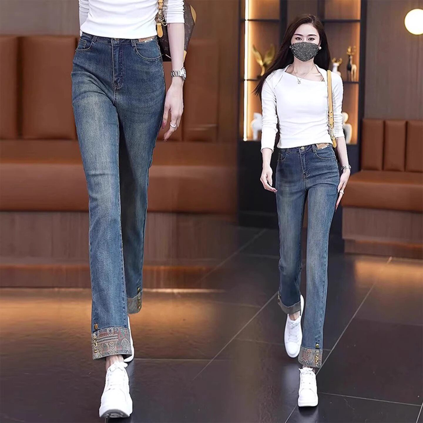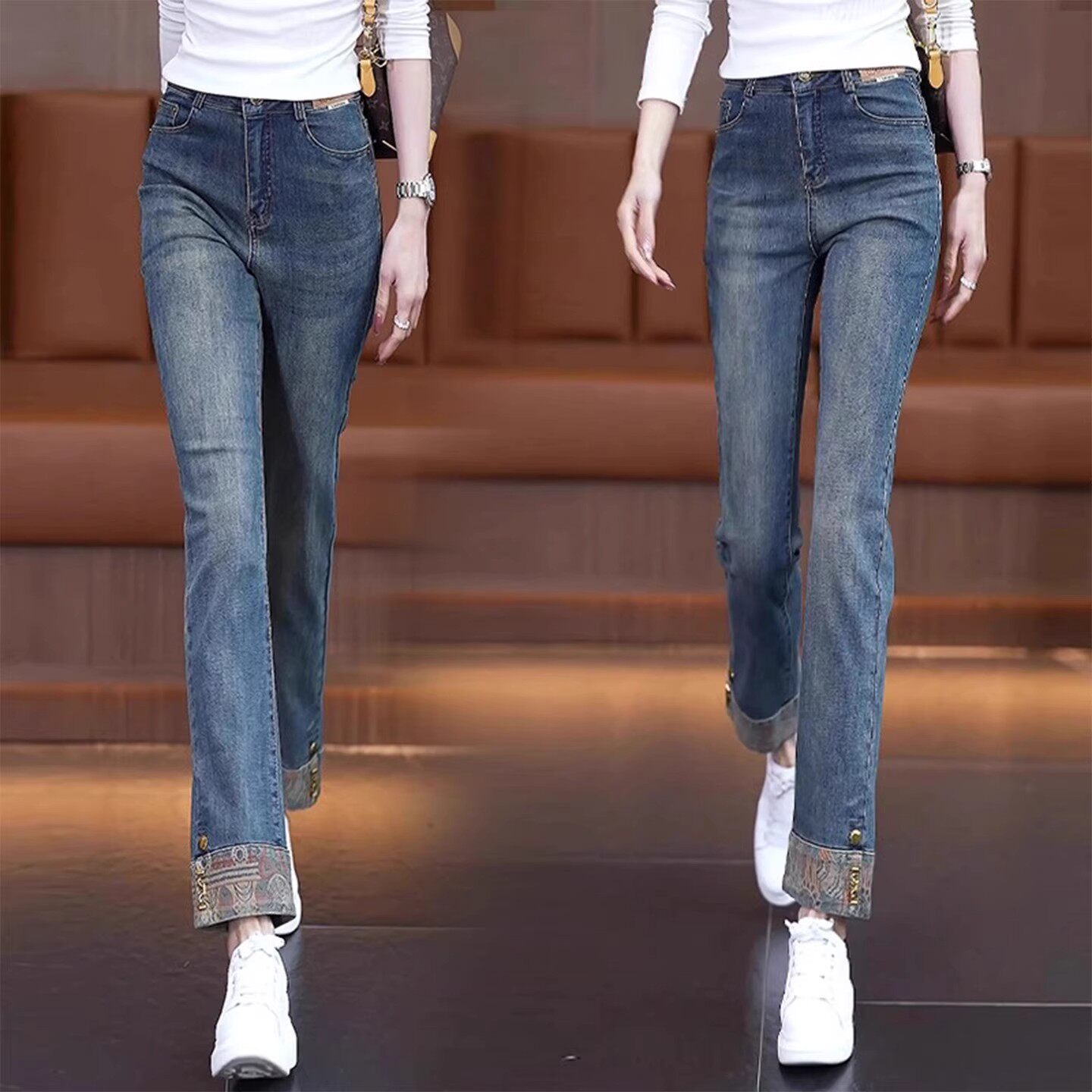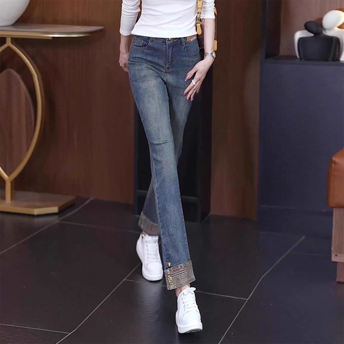 窄版牛仔裤女2026年新款春款九分高腰直筒裤国风新中式翻边烟管裤