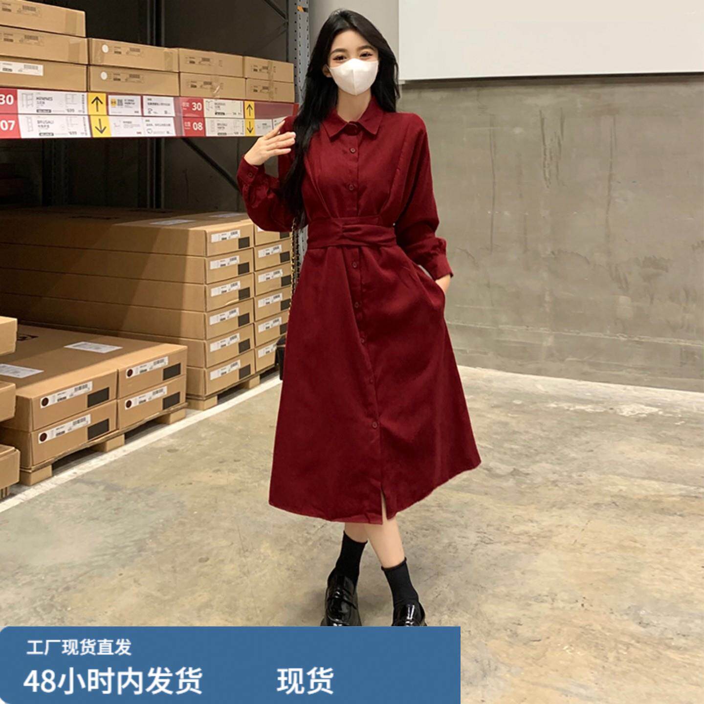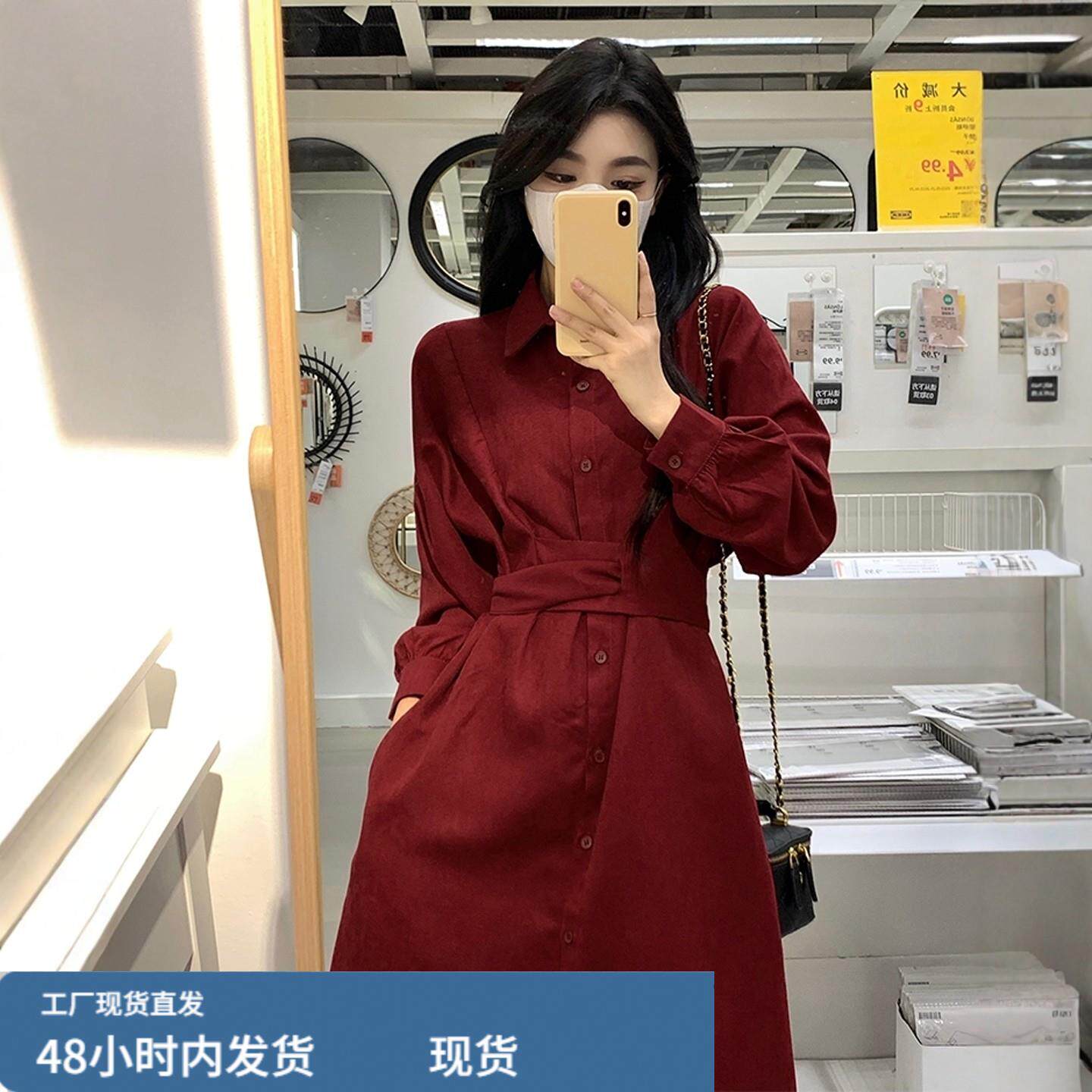 红色长袖衬衫连衣裙女秋冬新款大码胖mm显瘦高级感收腰气质长裙子