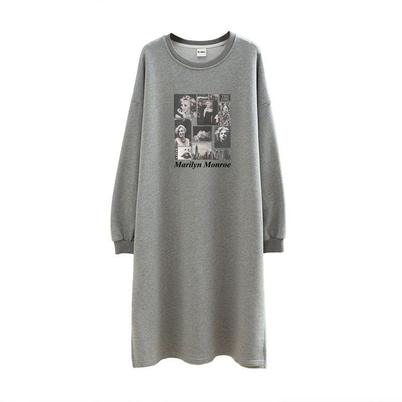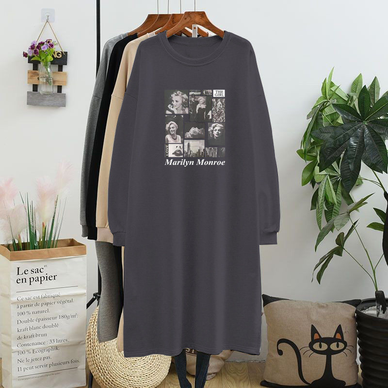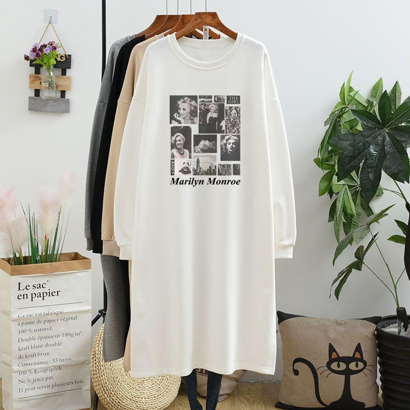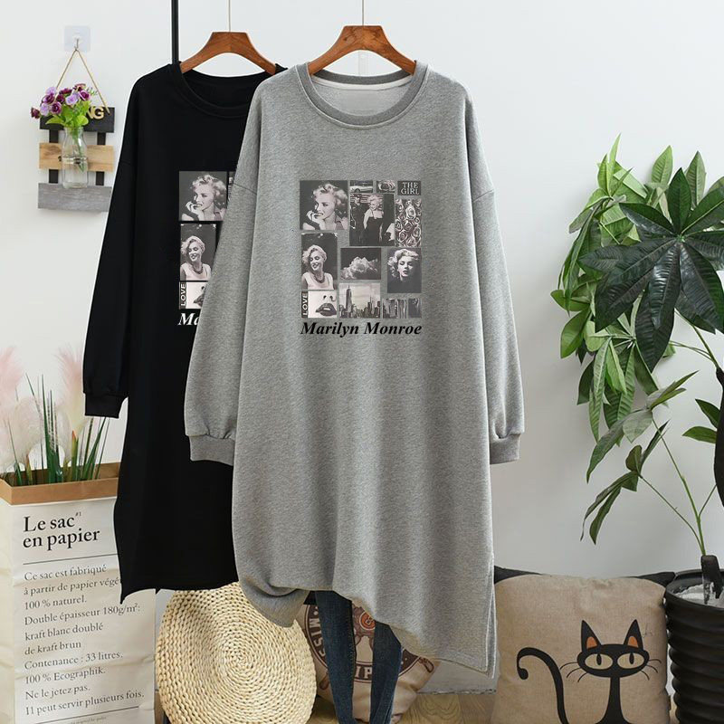 韩版秋季长袖棉质大码T恤裙女士宽松胖MM200斤中长款开叉连衣裙春