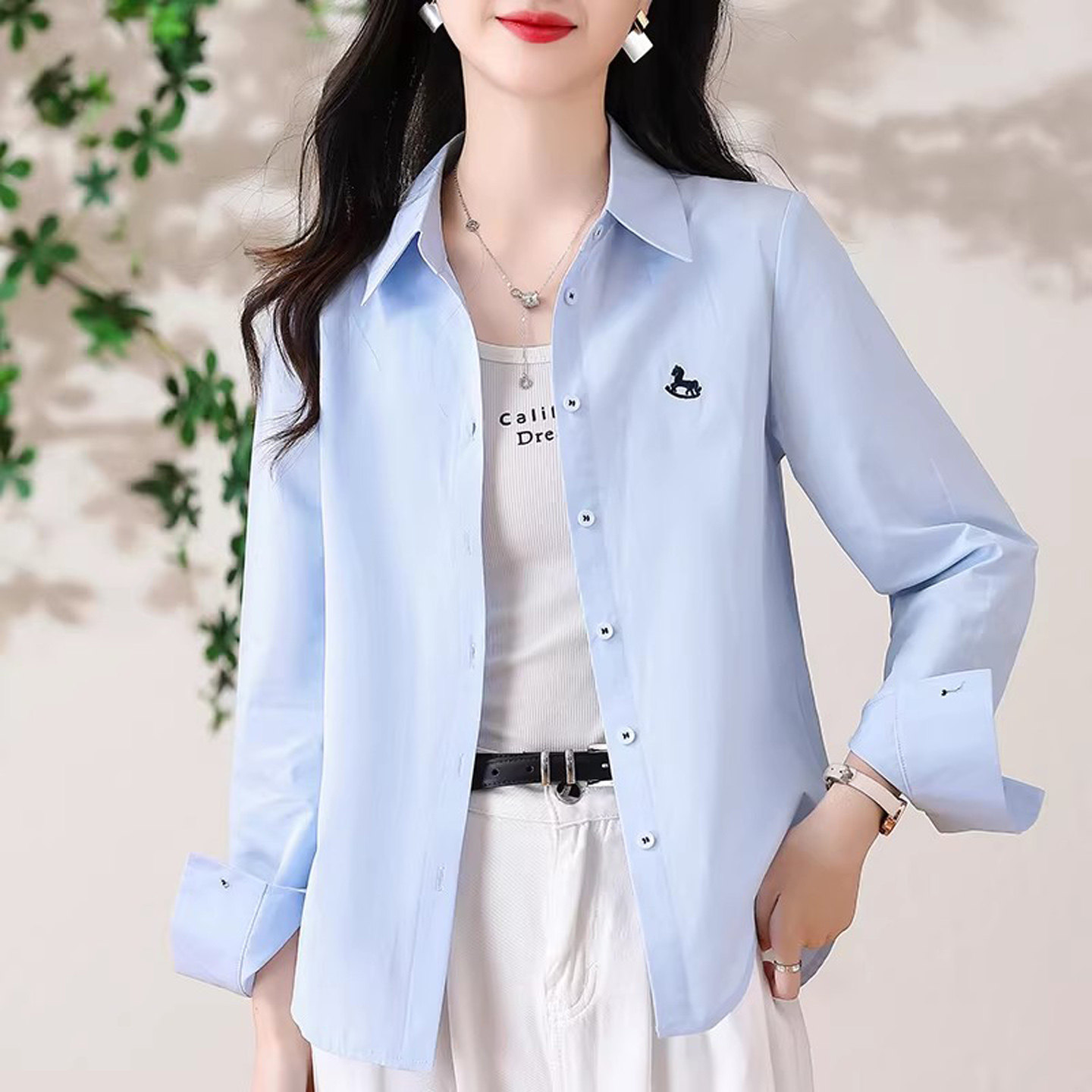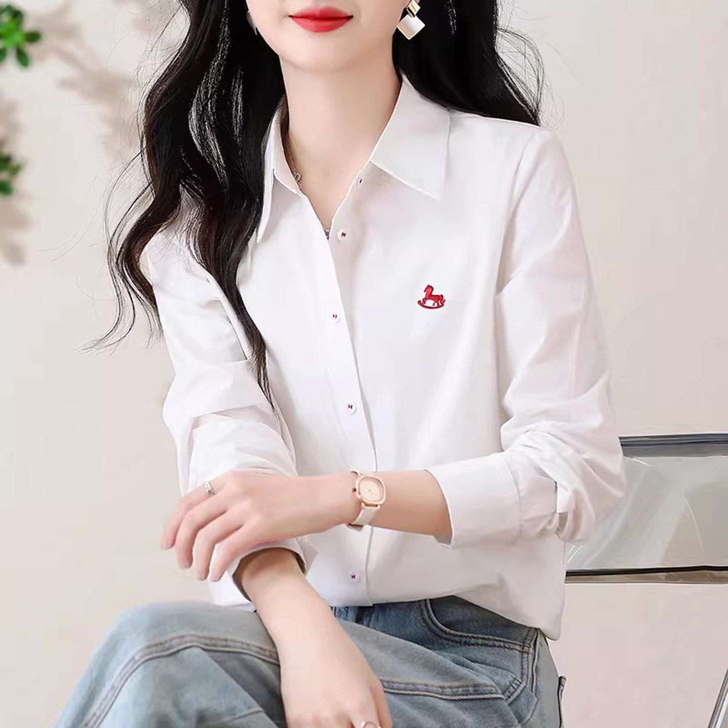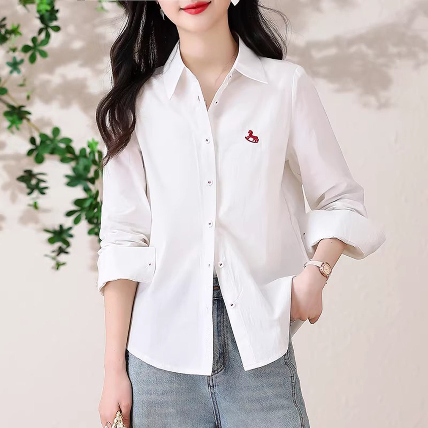 白色衬衫女款2026新款春装韩版小马刺绣纯棉上衣宽松百搭外穿衬衣
