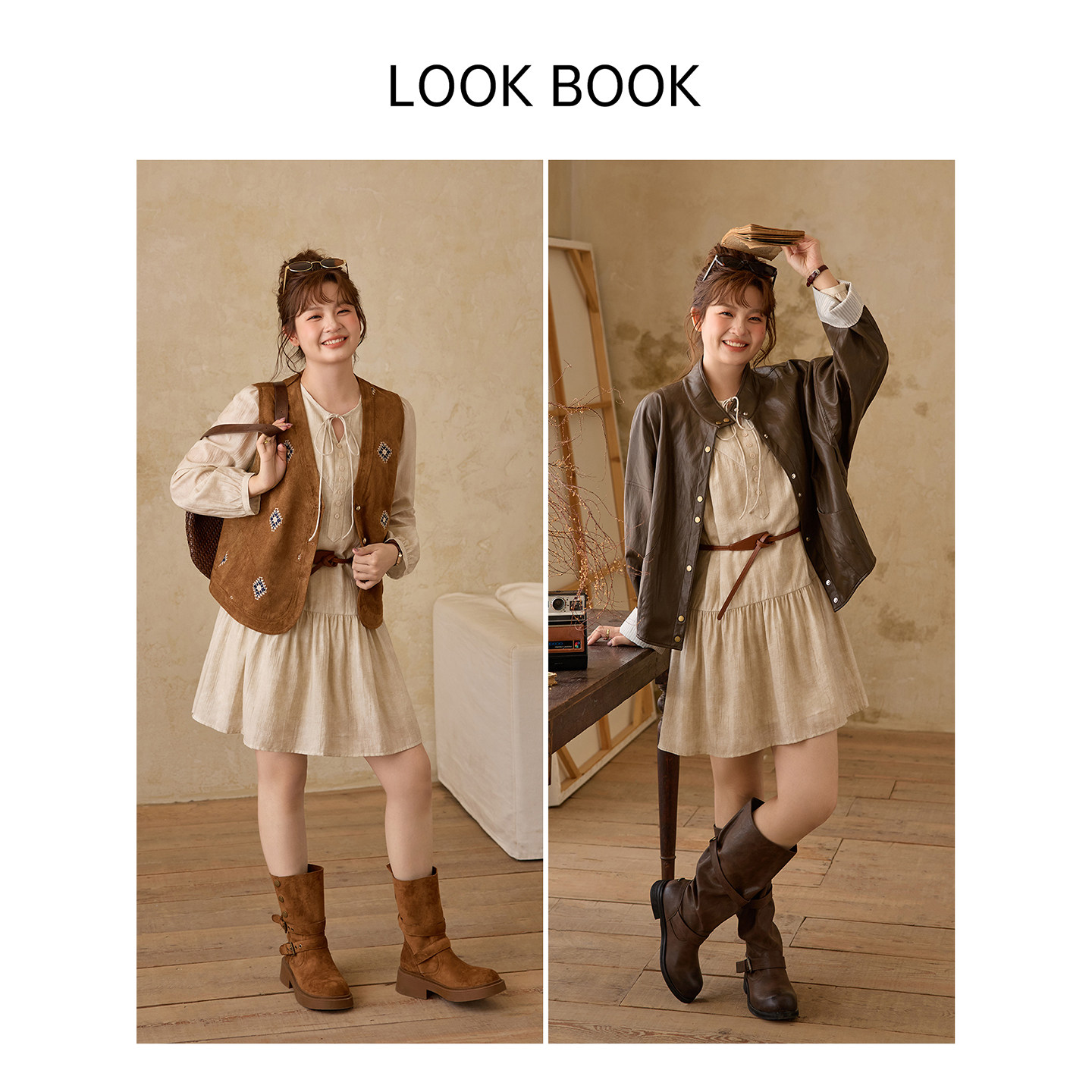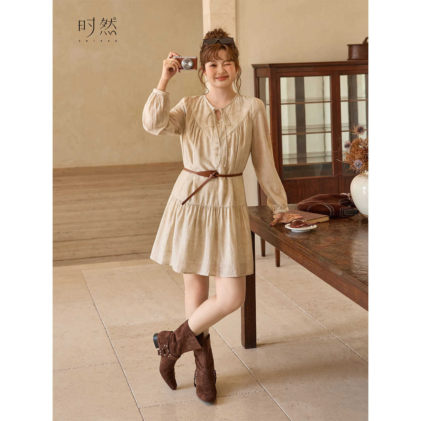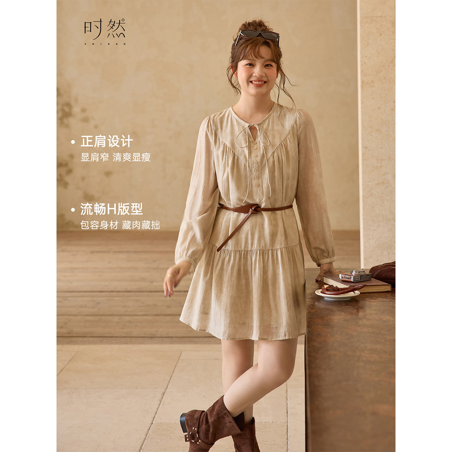 时然大码女装长袖连衣裙26春季新款微胖mm复古肌理感显瘦亚麻裙子