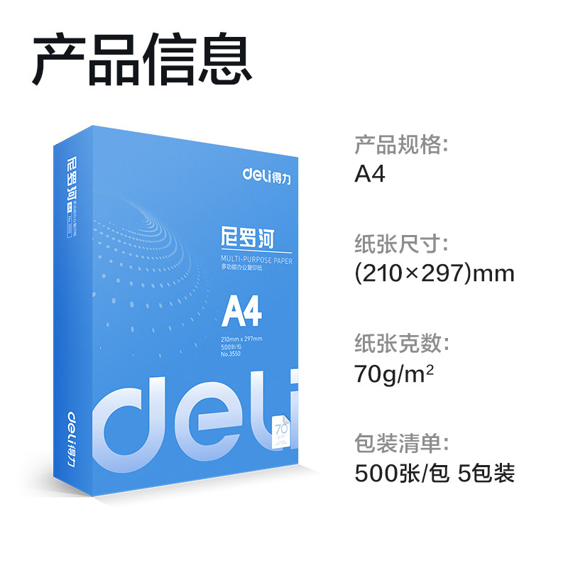 得力尼罗河复印纸加厚a4打印纸草稿纸学生用多功能办公用品打印白纸A4纸70g画画家用