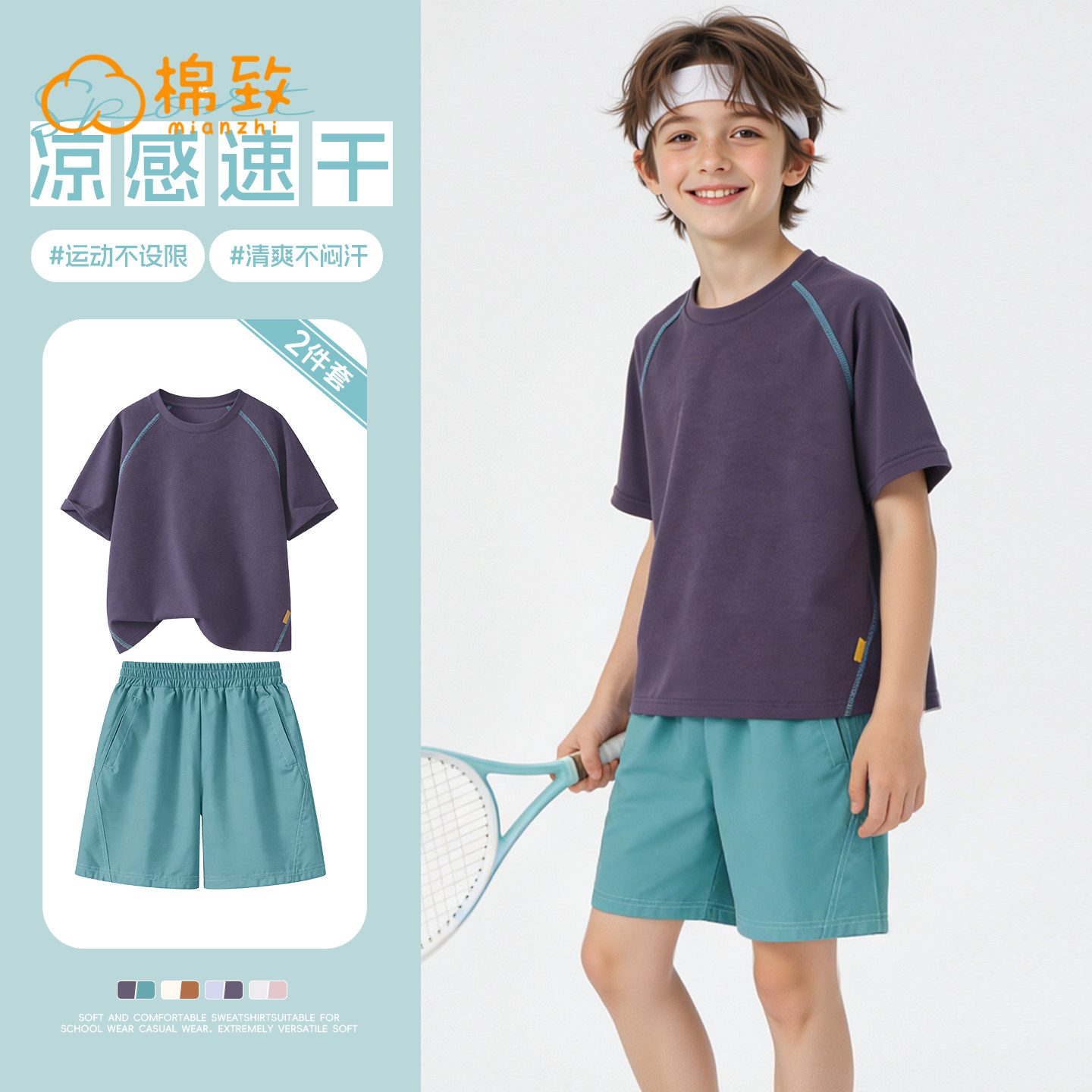 棉致男童夏套装2026新款夏季速干羽毛球短袖男孩夏装儿童运动服男