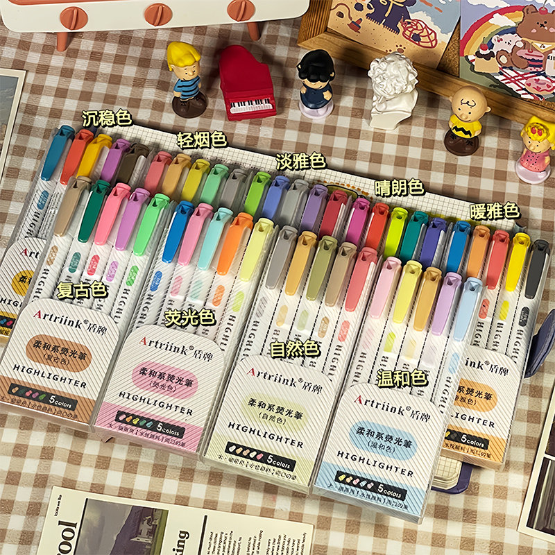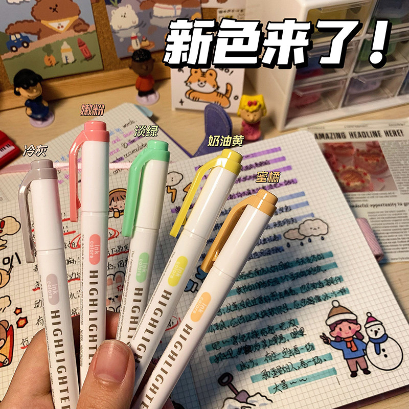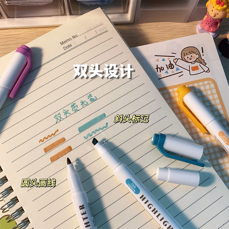 盾牌荧光笔小学生专用划重点记号笔彩色标记笔高颜值ins风初中生双头笔记不晕染儿童无毒萤光笔手帐笔荧光色