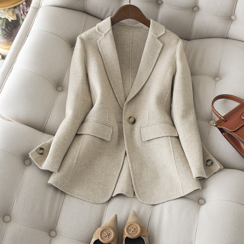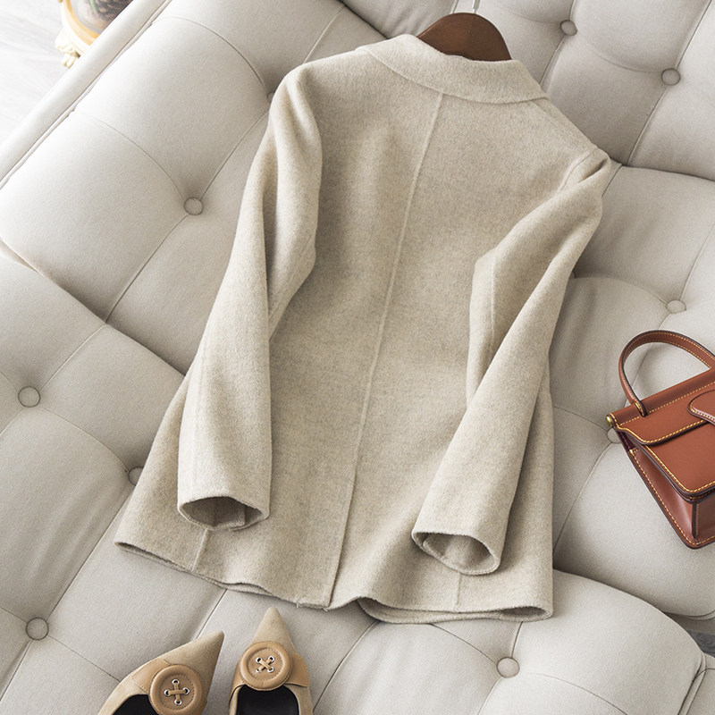 米色毛呢西装外套女秋冬小个子短款百搭高端人字纹双面呢羊绒大衣