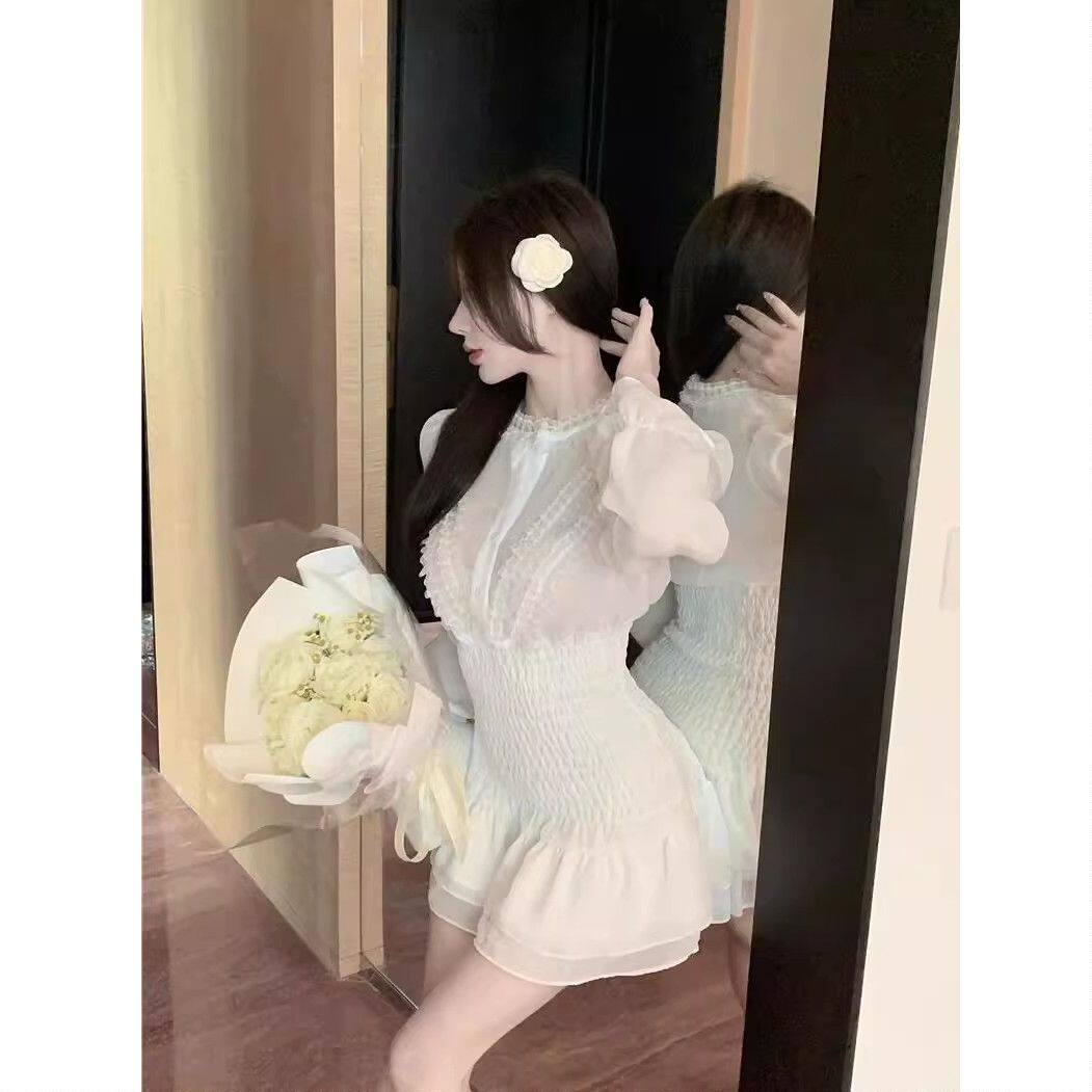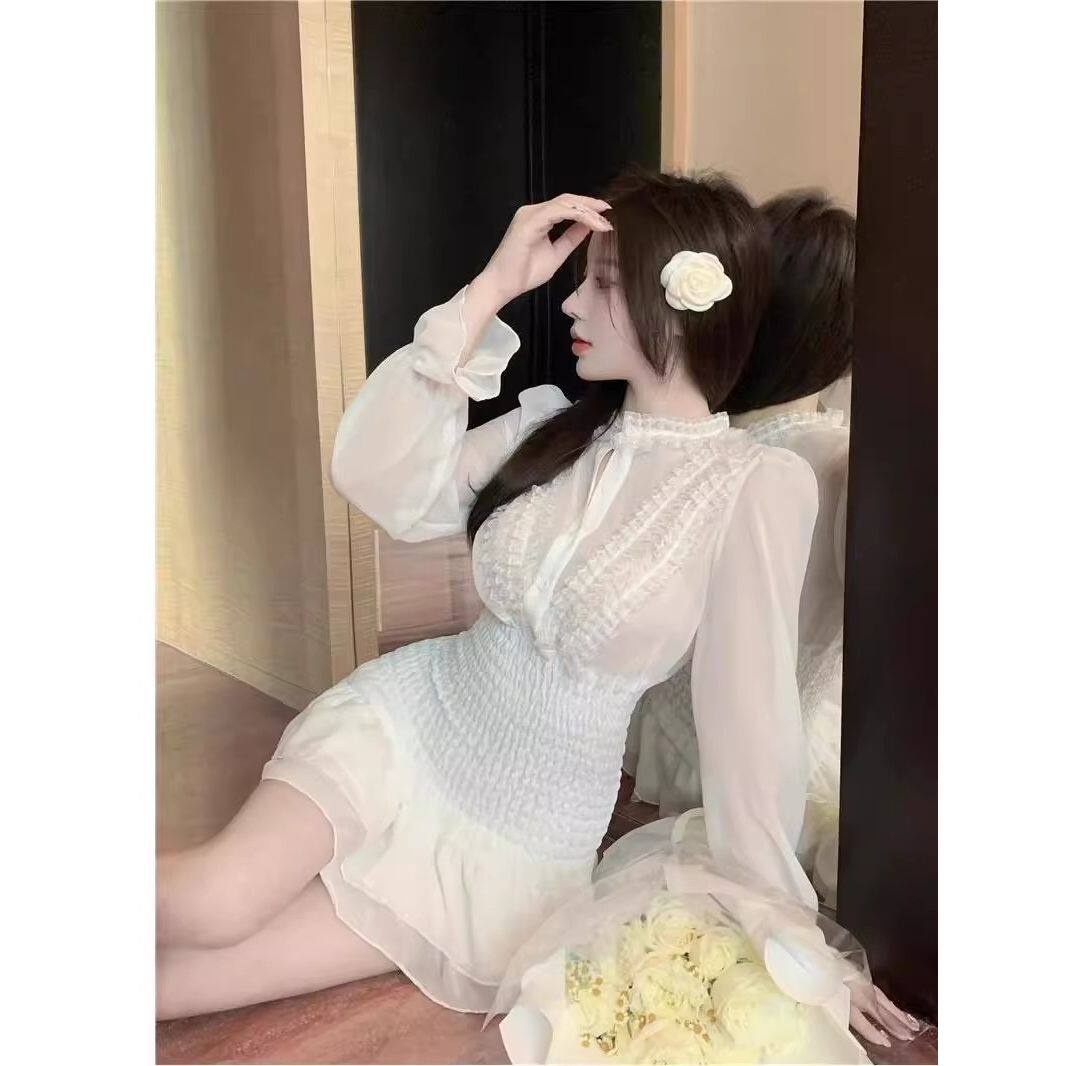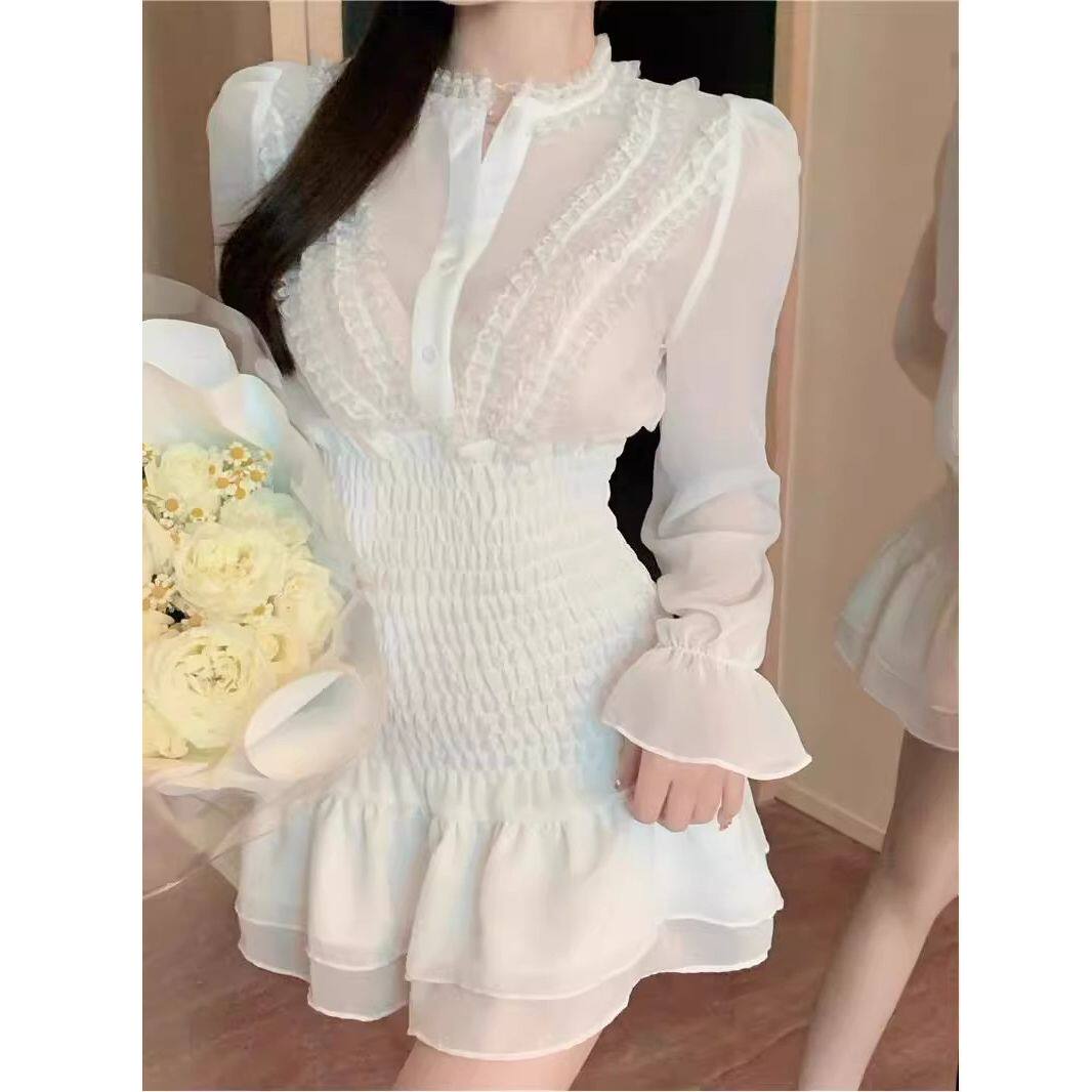 秋季荷叶边长袖雪纺衬衫连衣裙夏季褶皱气质高级感收腰仙女短裙子