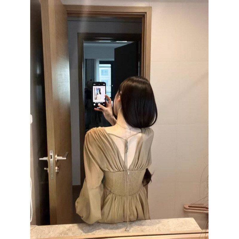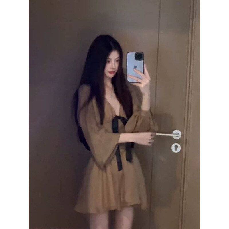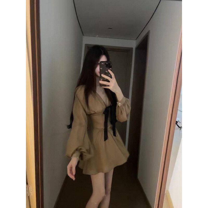 风字V显瘦雪纺连衣裙A女领短裙子长袖名媛气质秋冬法式蝴蝶结收腰