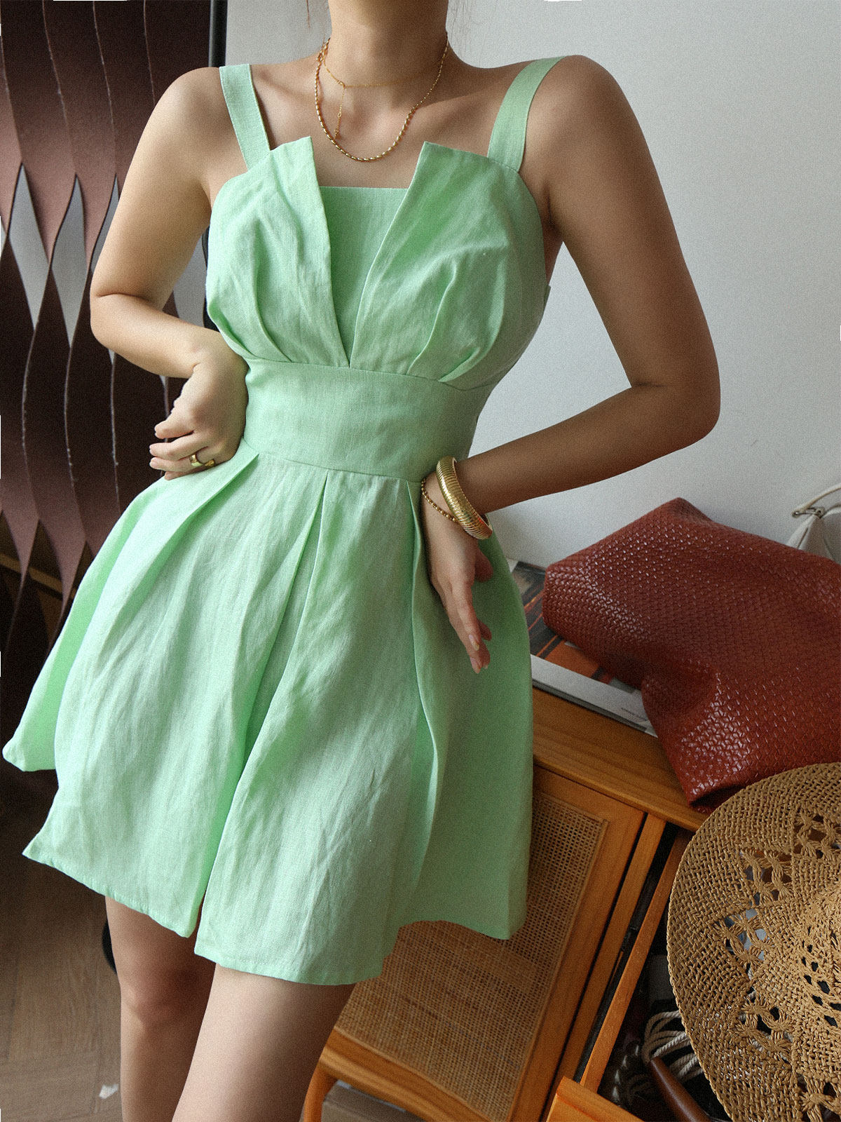 精灵甜心 复古纯亚麻中短款收腰A字无袖连衣裙 清爽甜美轻礼服裙