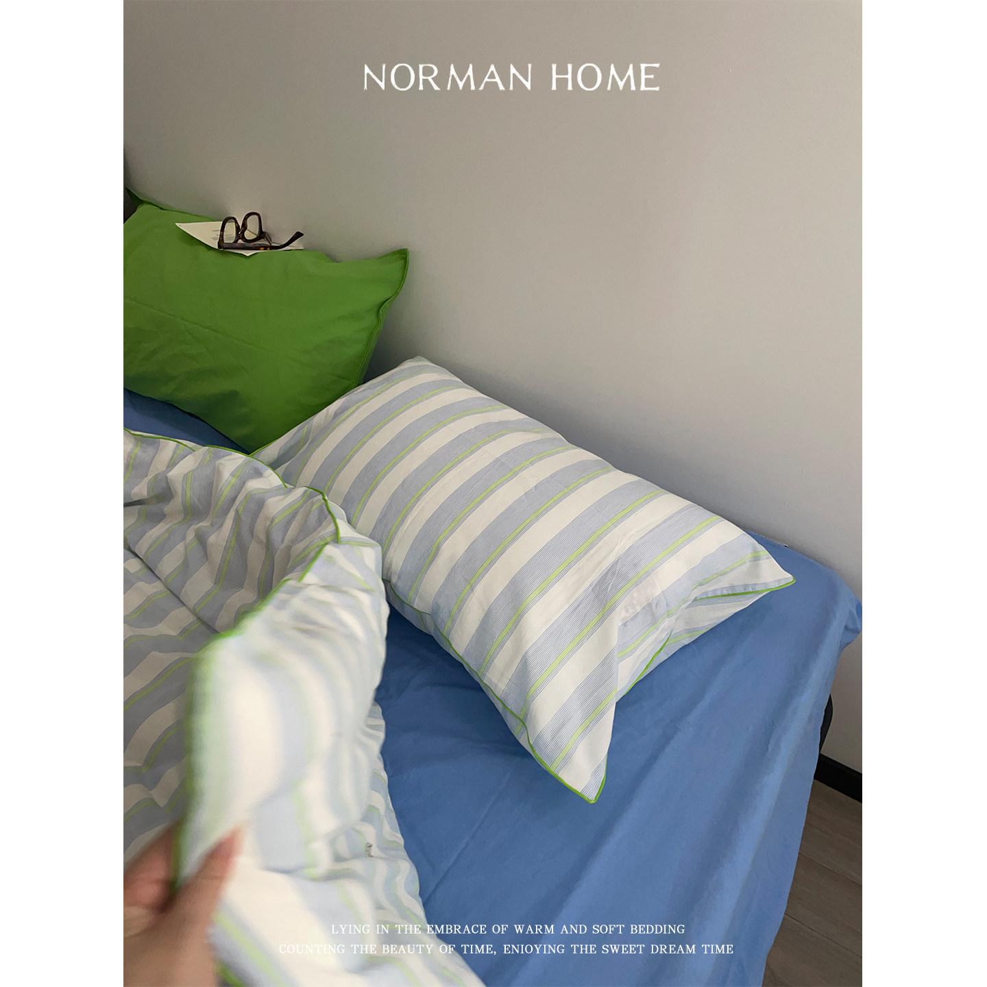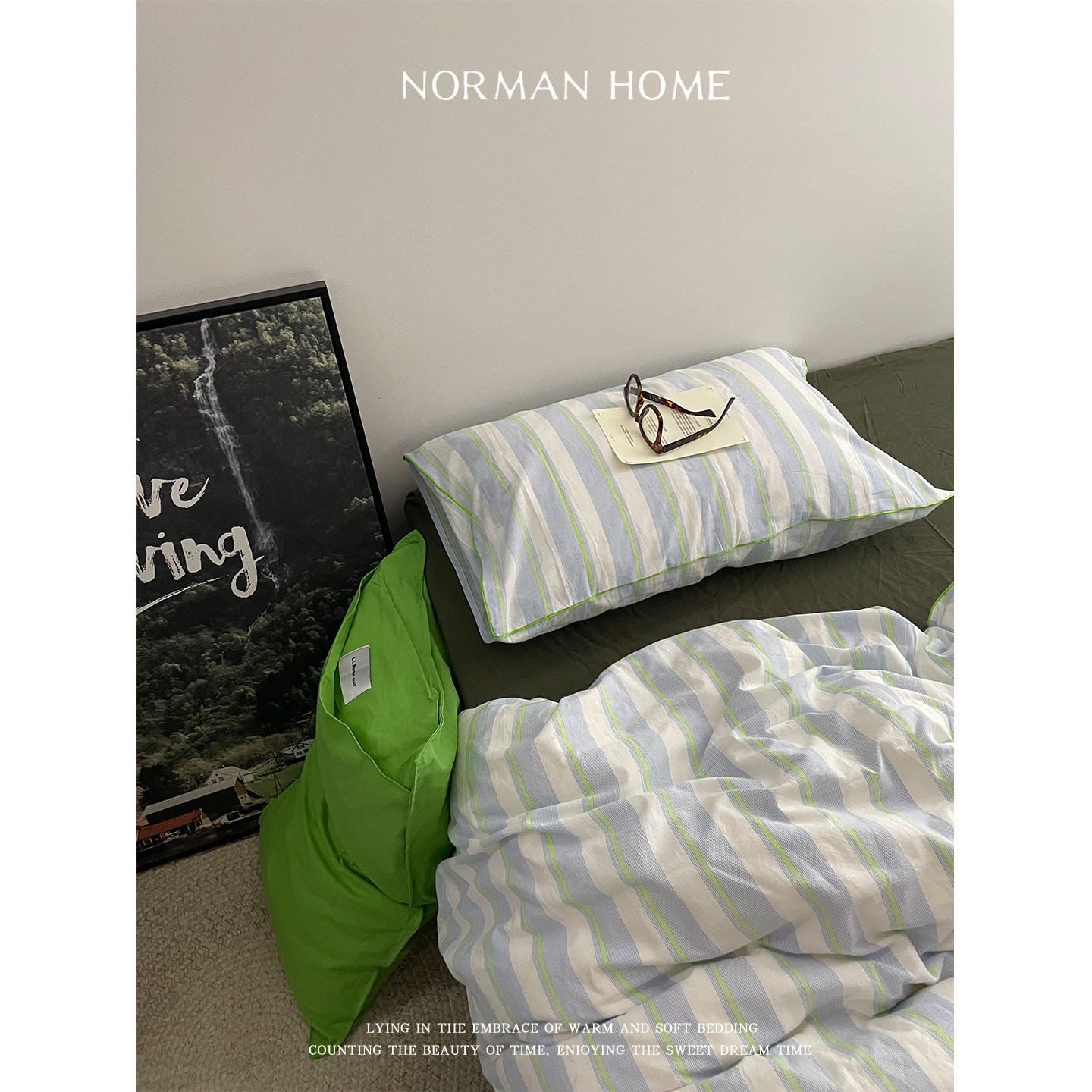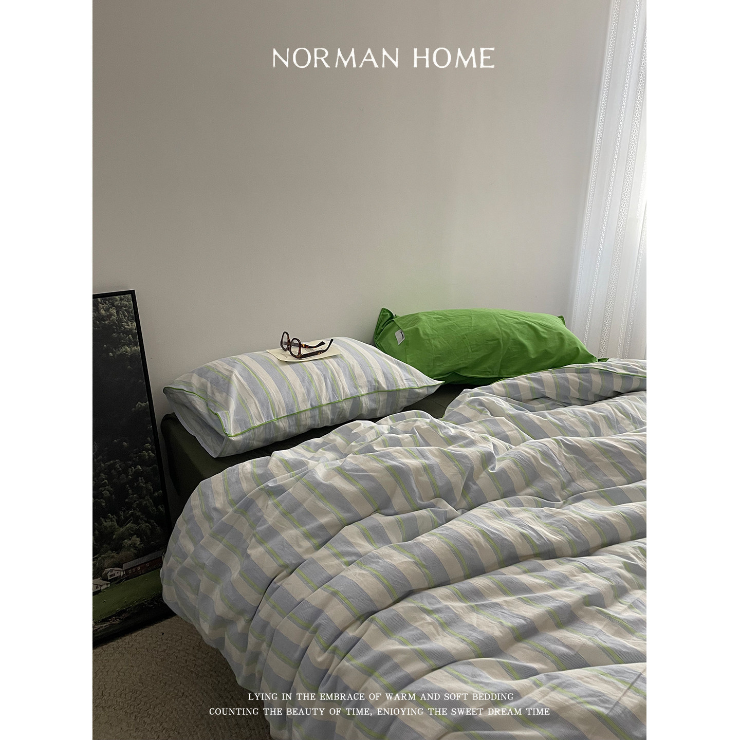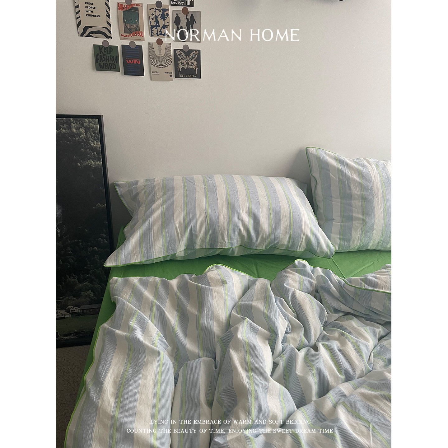 他夏了夏天/ins风条纹水洗棉床上四件套纯棉全棉床单被套床笠床品