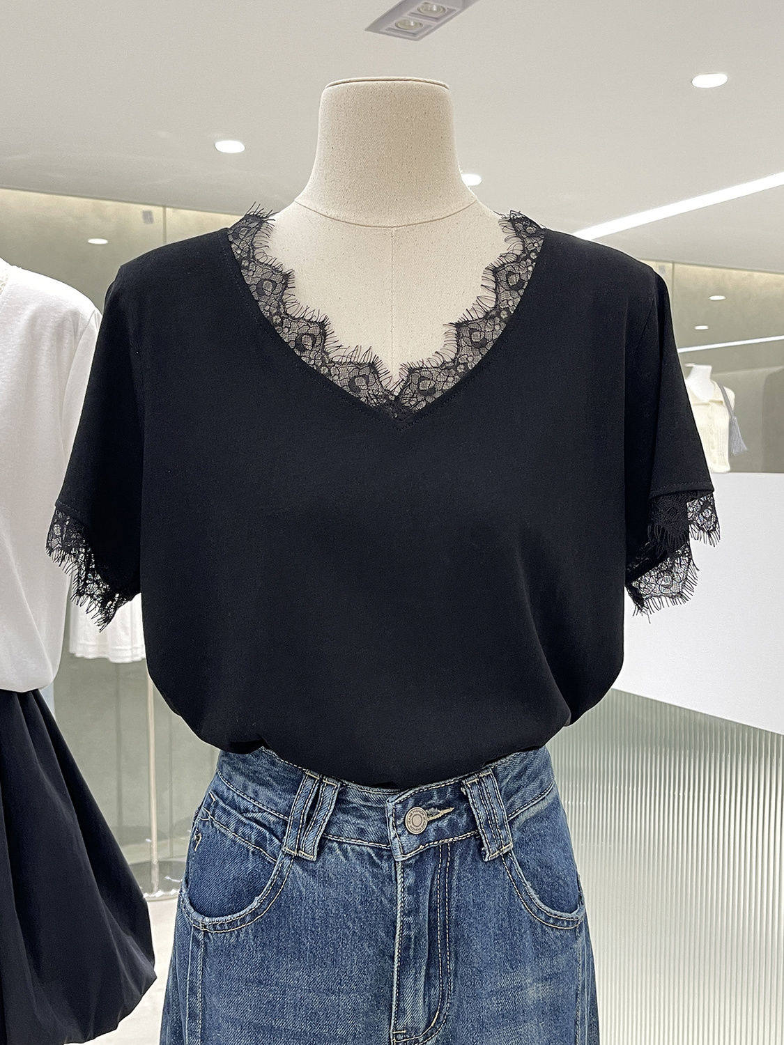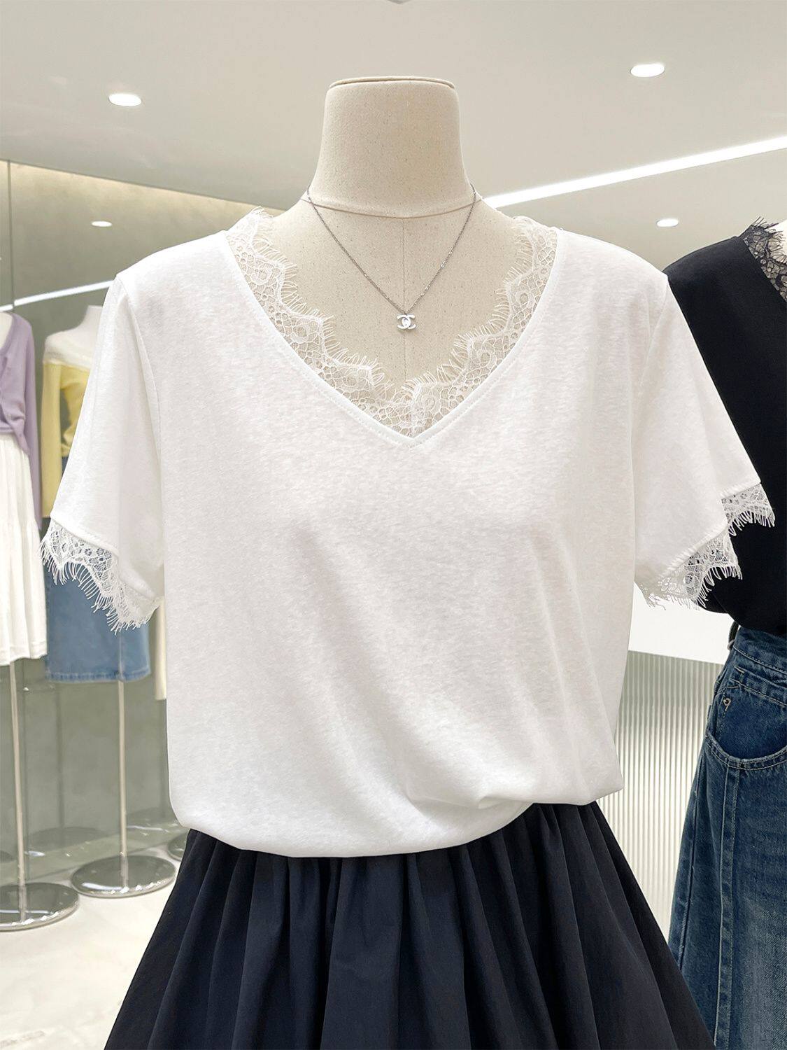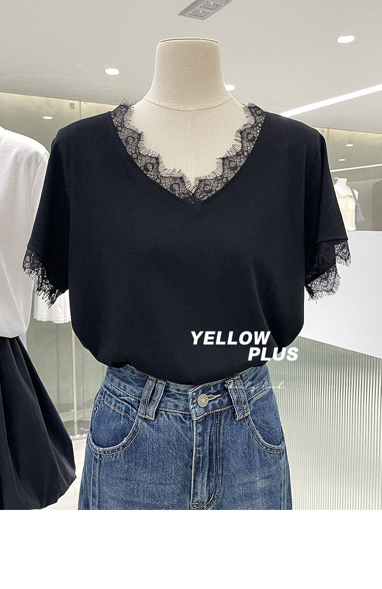 超大码法式纯欲风设计感蕾丝拼接V领套头短袖T恤春装女款新款上衣