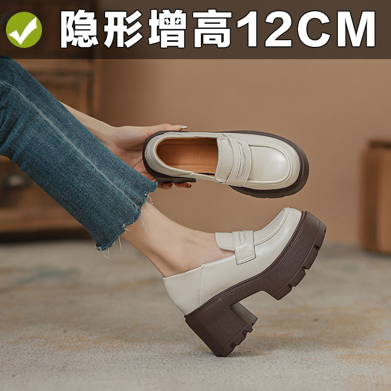 真皮内增高粗跟高跟乐福鞋女新款矮子乐增高小皮鞋超厚底女鞋12cm