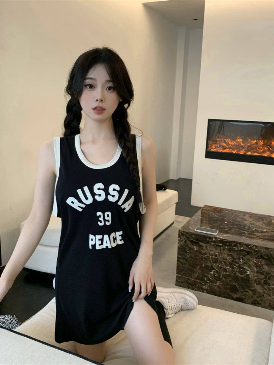 大码300斤运动风字母背心吊带睡裙女夏季设计感时尚无袖T裙连衣裙
