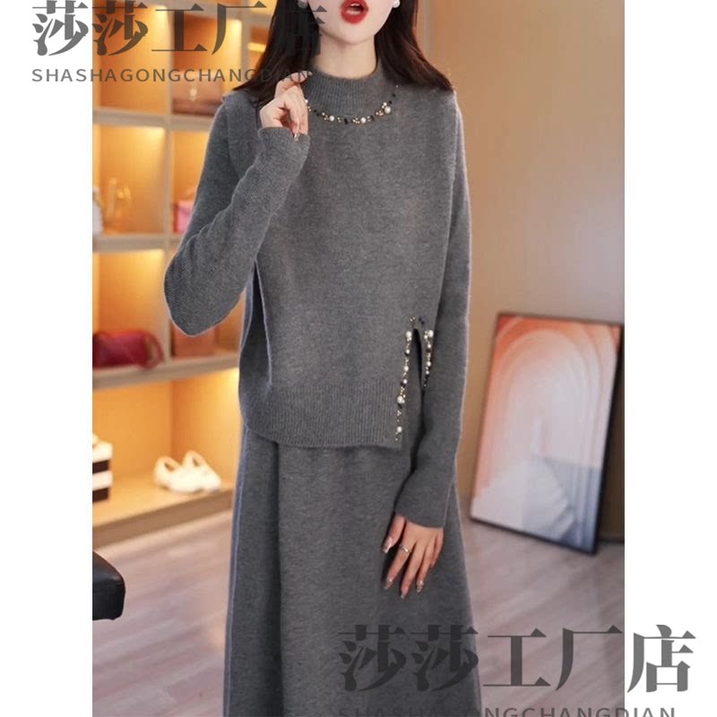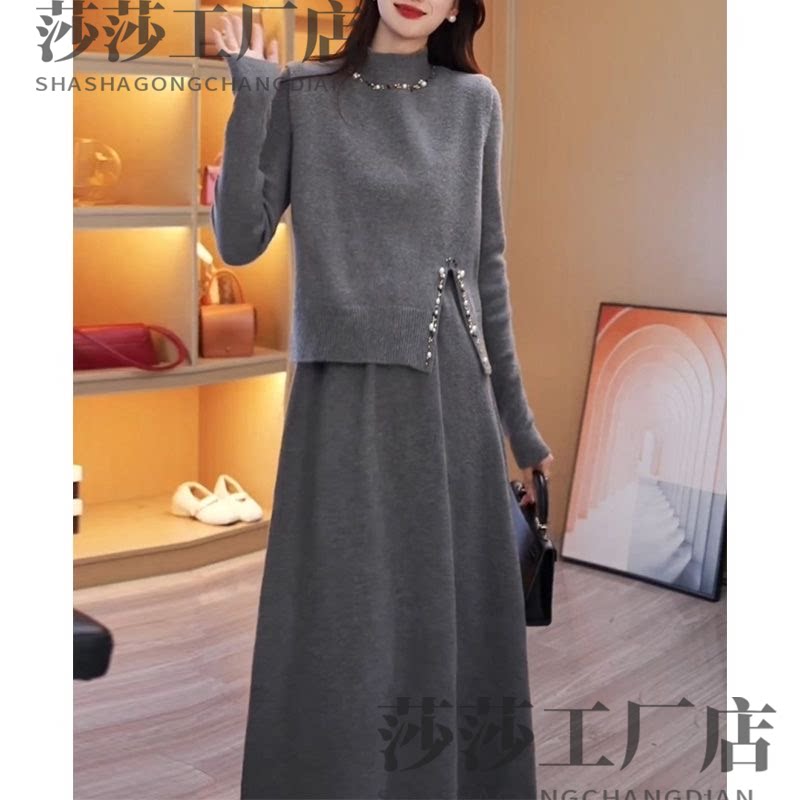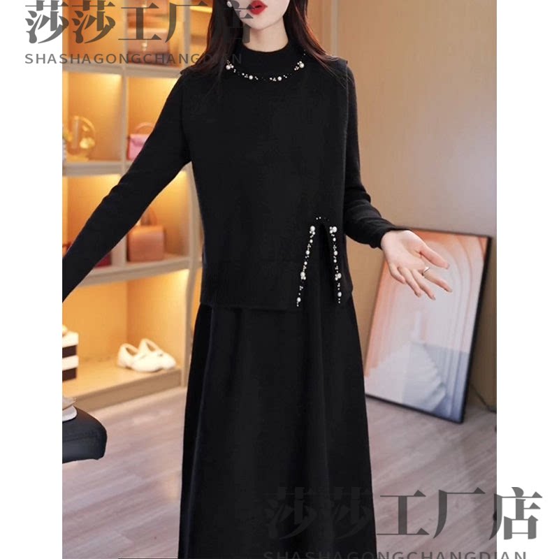高档钉珠两件套中长款针织连衣裙2026秋冬新款韩版减龄时尚打底裙