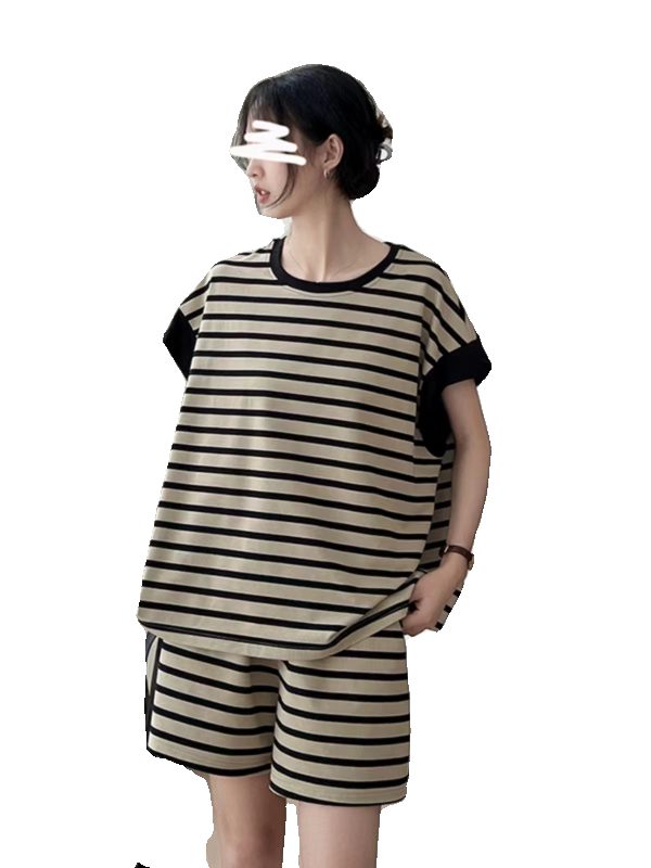 2026夏季新款时尚女装条纹显瘦遮肉套装微胖短袖T恤+短裤两件套女