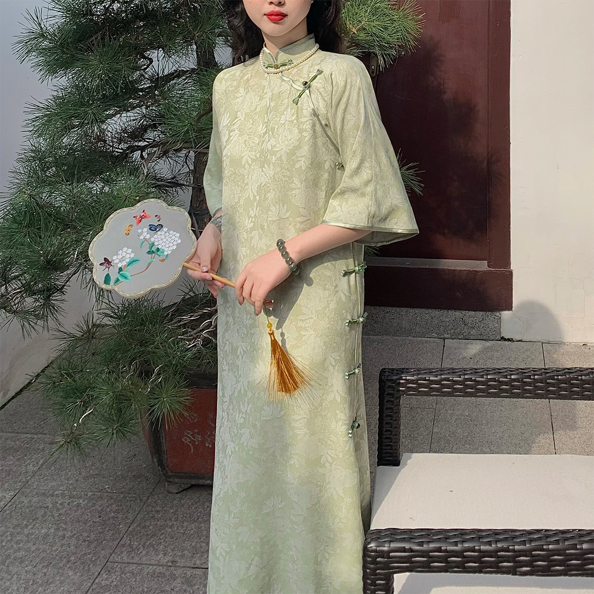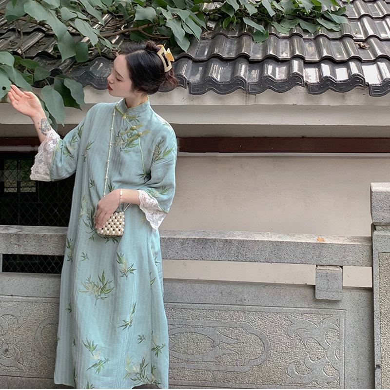 大码女装复古日常改良倒大袖旗袍连衣裙2023春夏胖mm200斤长裙
