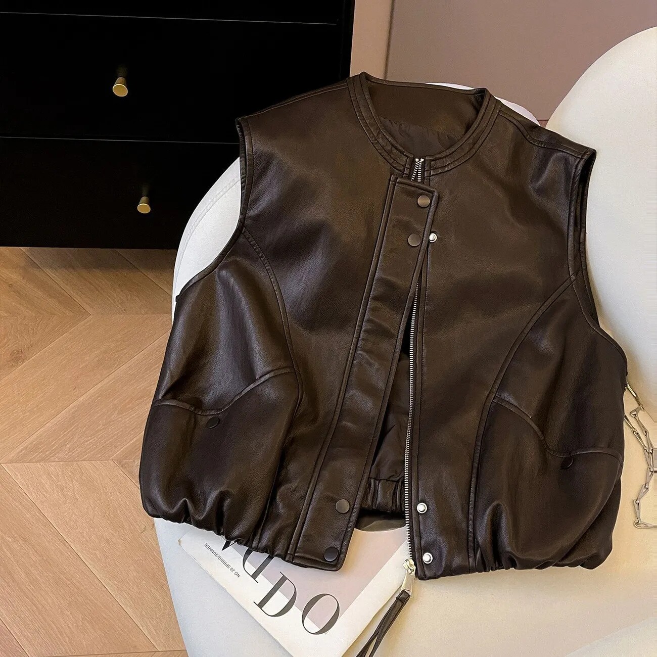 美拉德穿搭咖色皮马甲女款2026春秋新款时髦洋气无袖马夹背心上衣