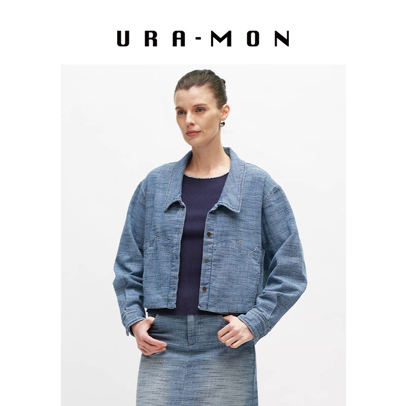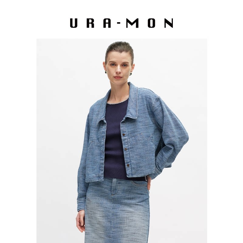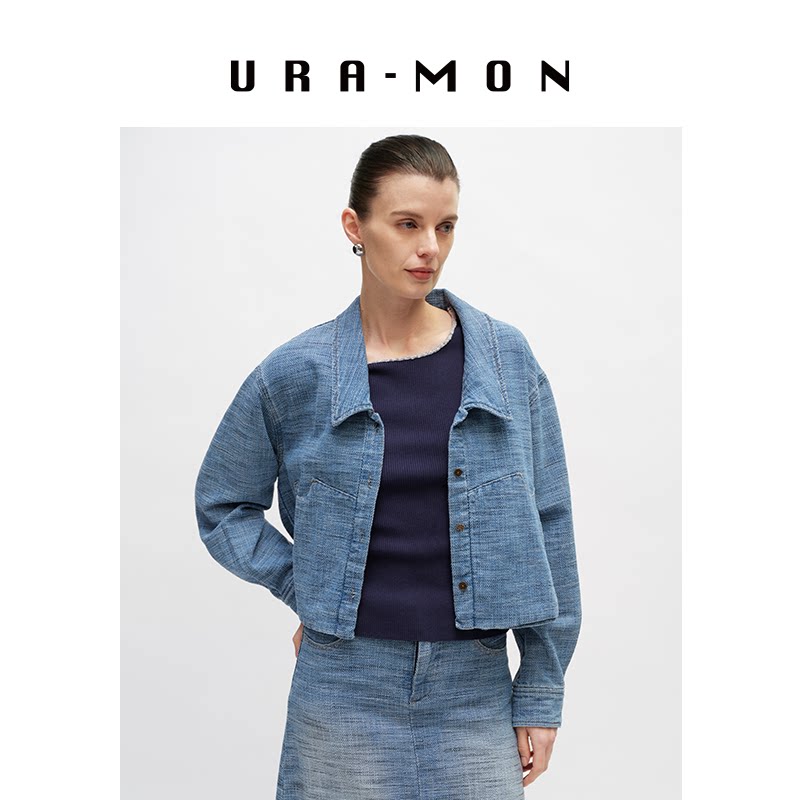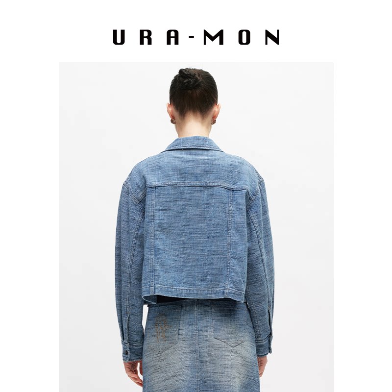 URA-MON|牛仔肌理短款外套翻领女款水洗丹宁早春新款正肩夹克