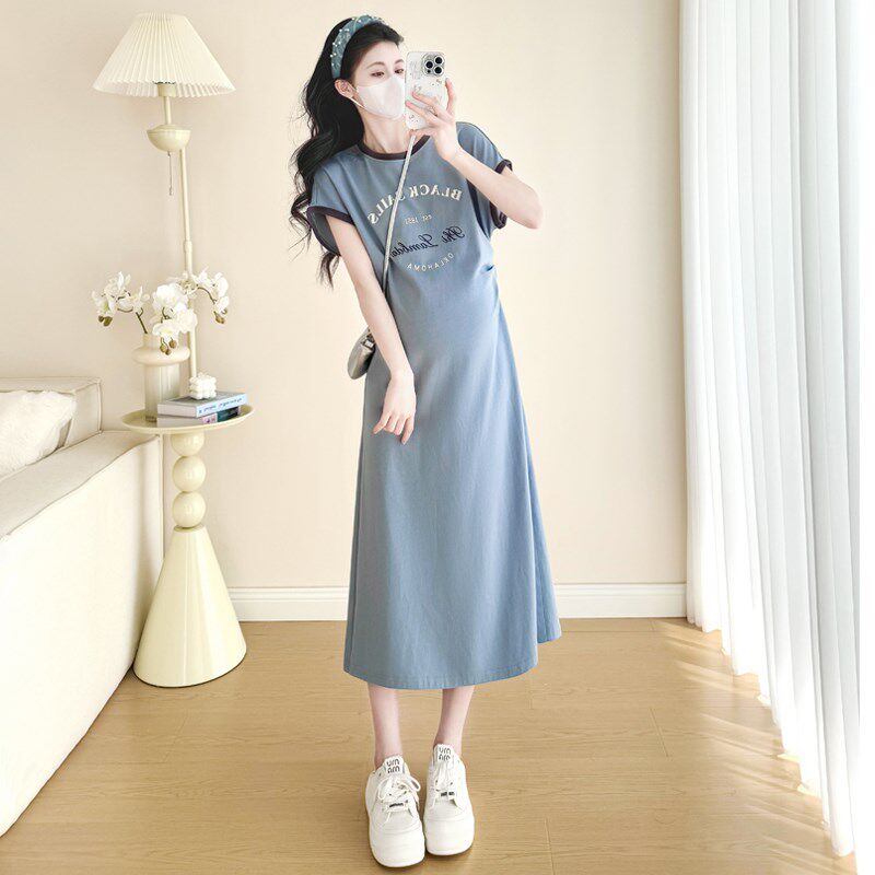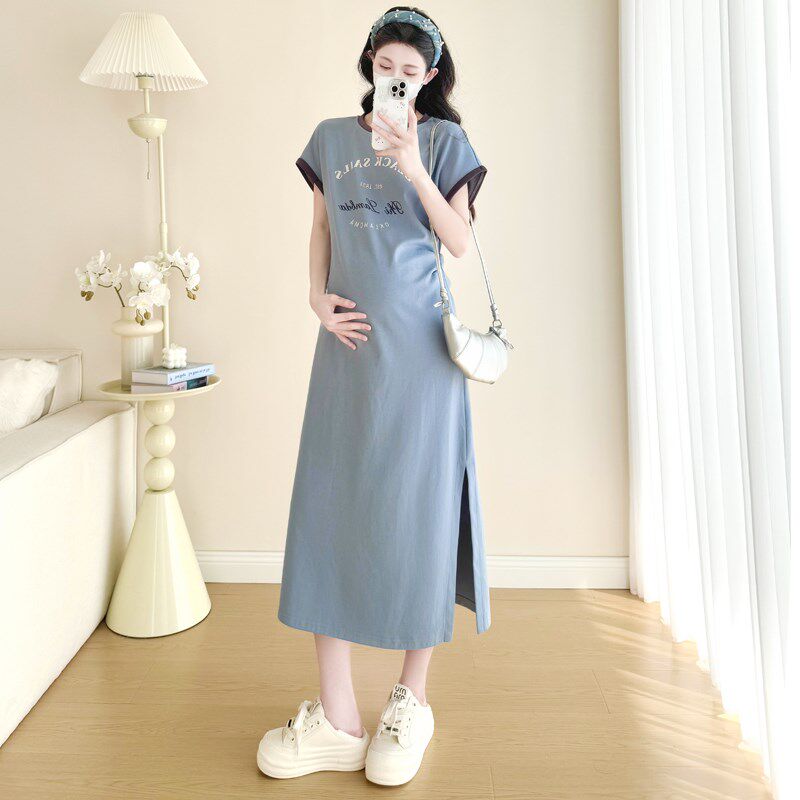 大码孕妇连衣裙夏装短袖T恤裙过膝长款休闲宽松开叉显瘦潮妈200斤