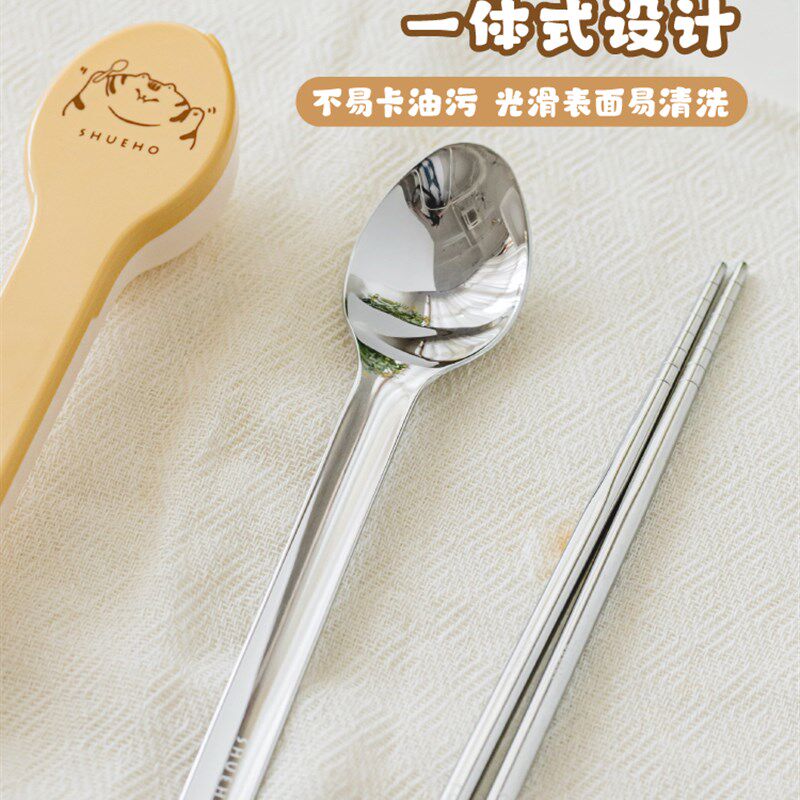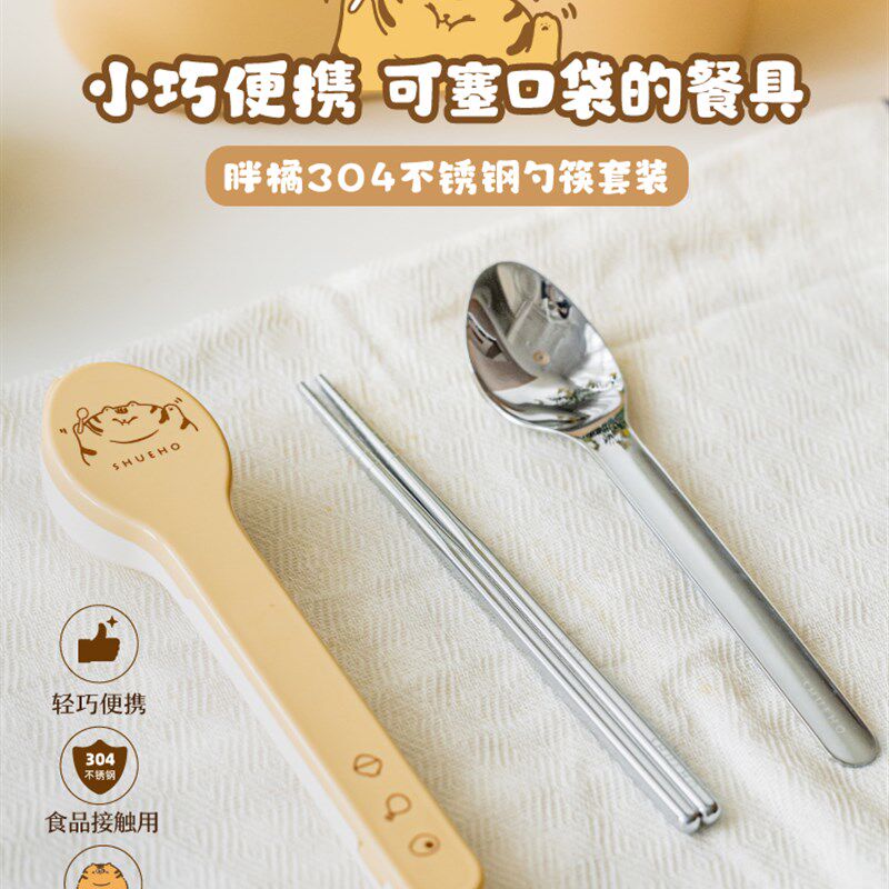 舒克胖橙色便携式单人餐具,专为学生和儿童外出筷子和勺子存储盒