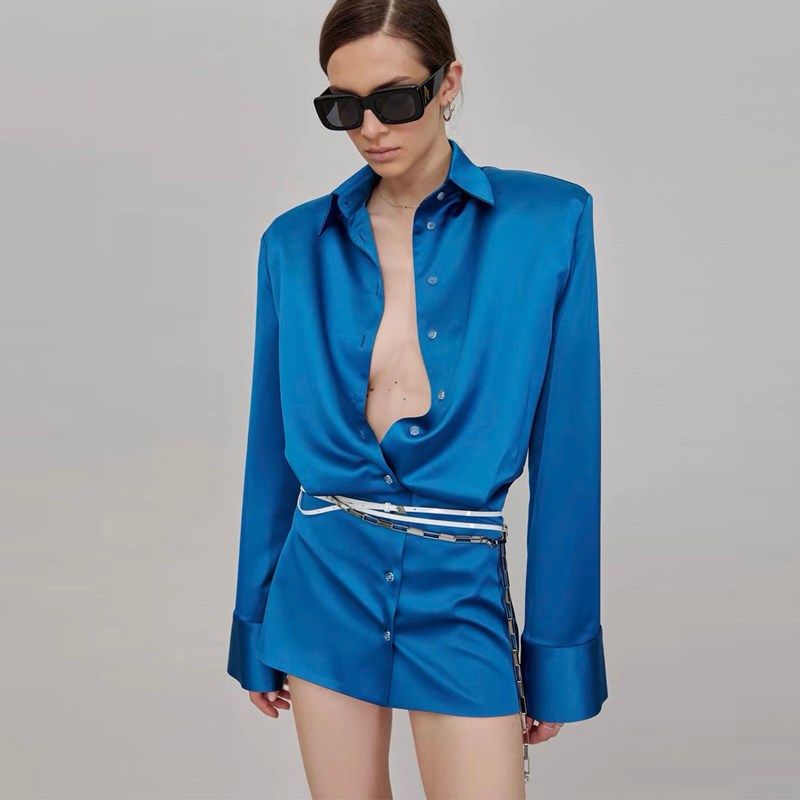 衬衫连衣裙2024春秋新款深蓝色长袖修身显瘦气质短款紧身包臀裙女