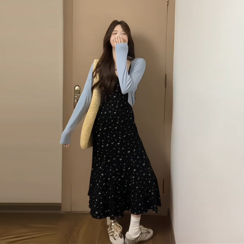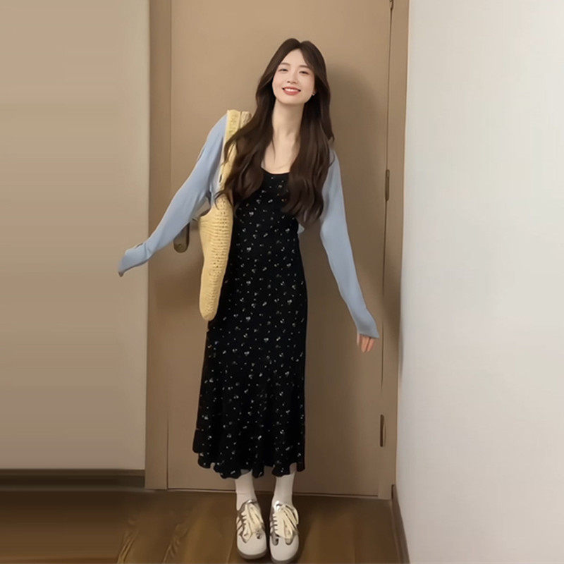 法式复古碎花吊带连衣裙套装女夏2025新款韩系小个子穿搭鱼尾长裙