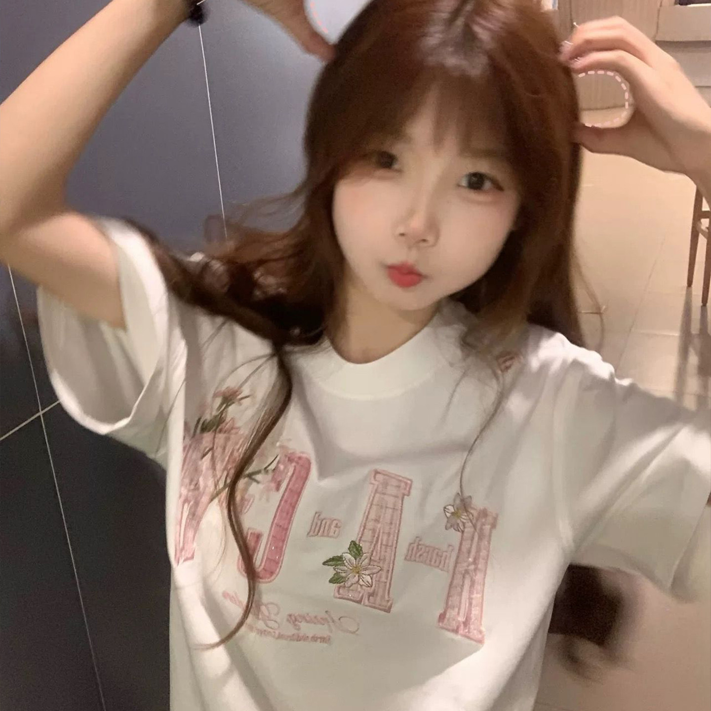 美式复古字母刺绣短袖t恤女大童初中高中学生宽松纯棉上衣韩版