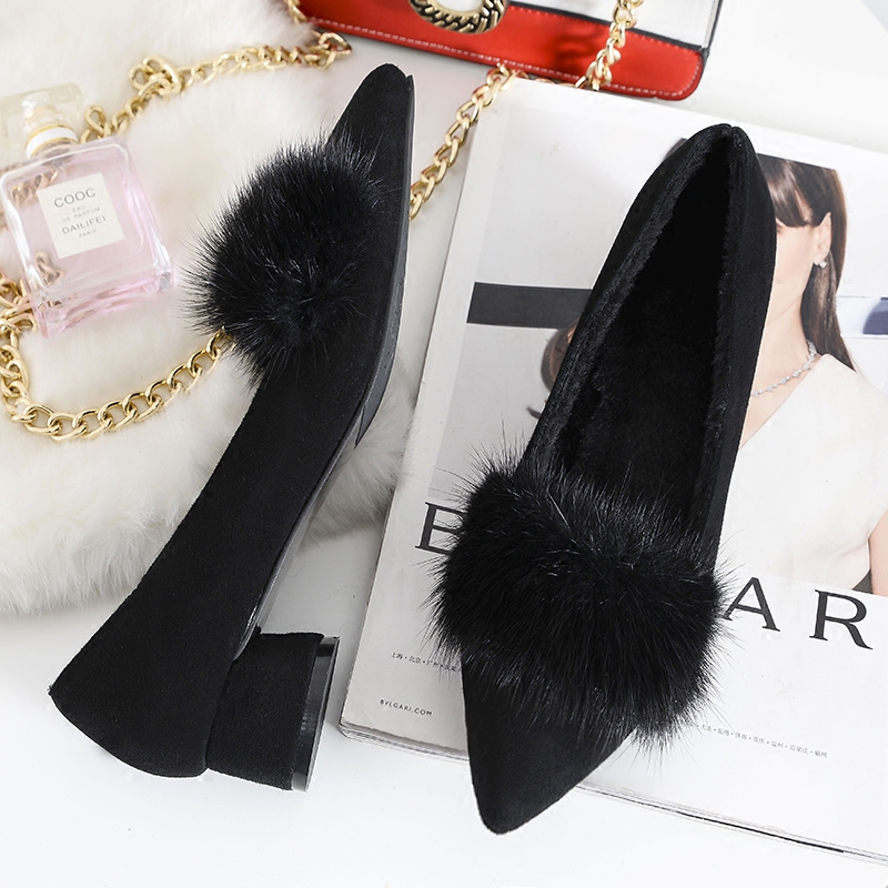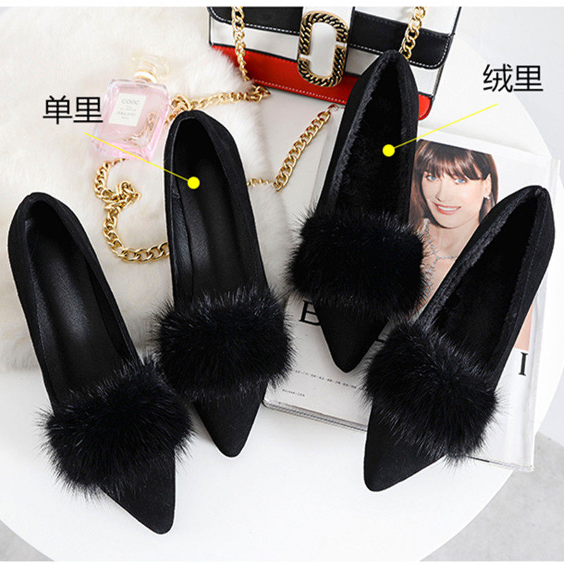 尖头毛毛鞋女豆豆鞋女冬季棉瓢鞋女加绒单鞋坡跟内增高真皮水貂毛
