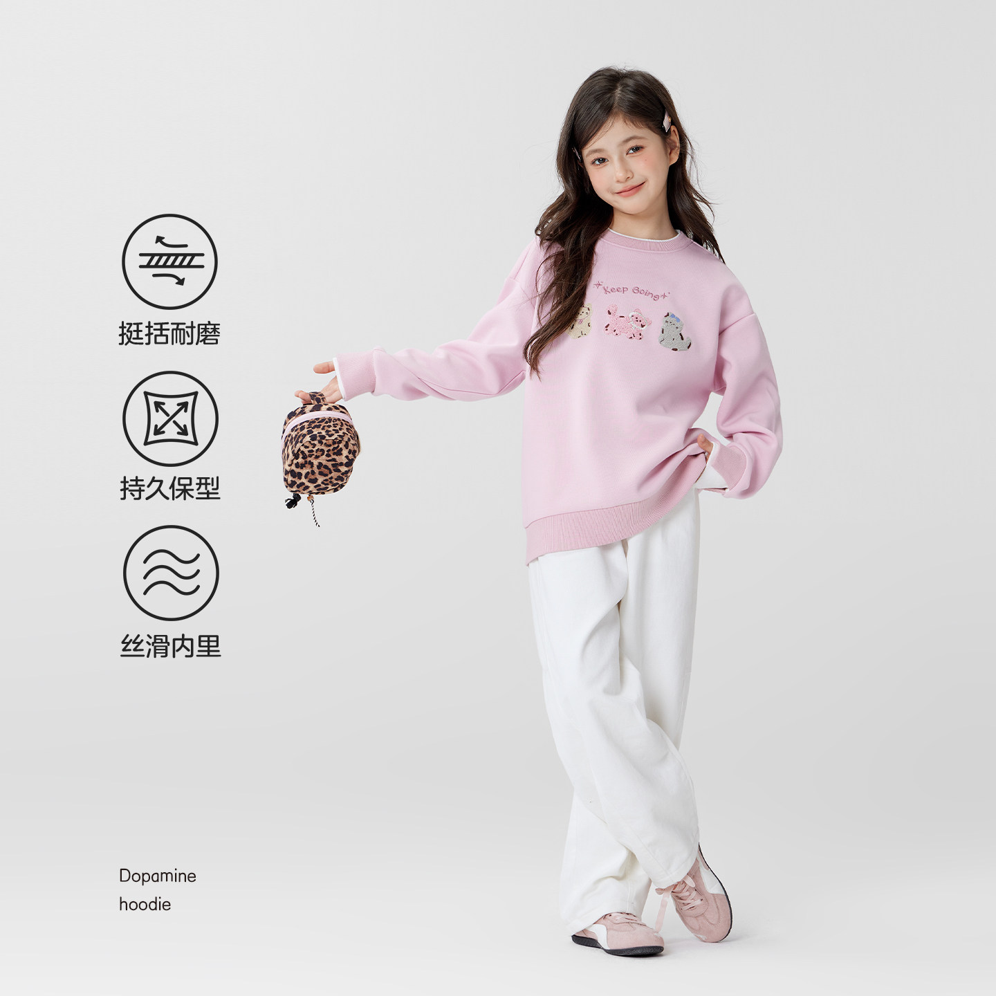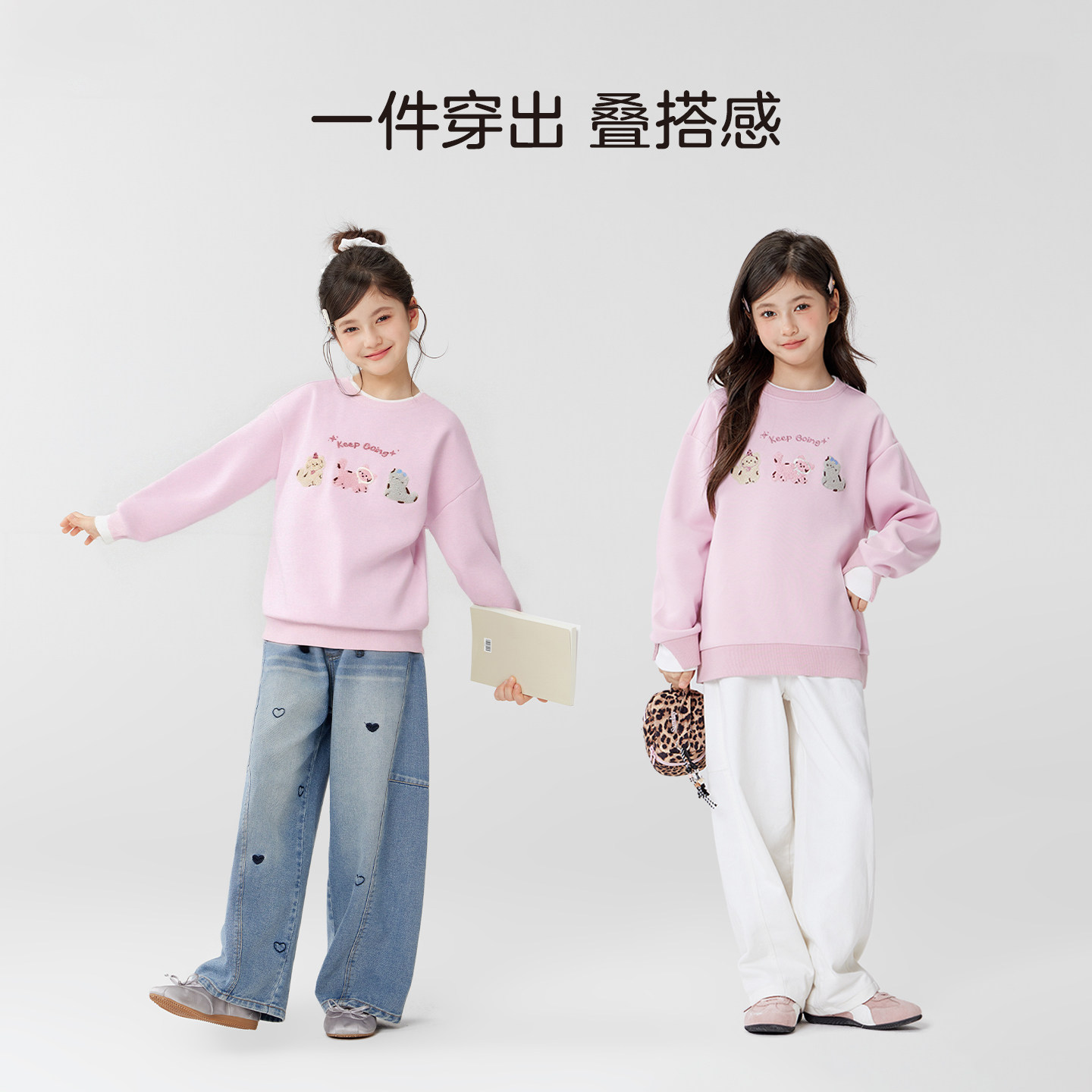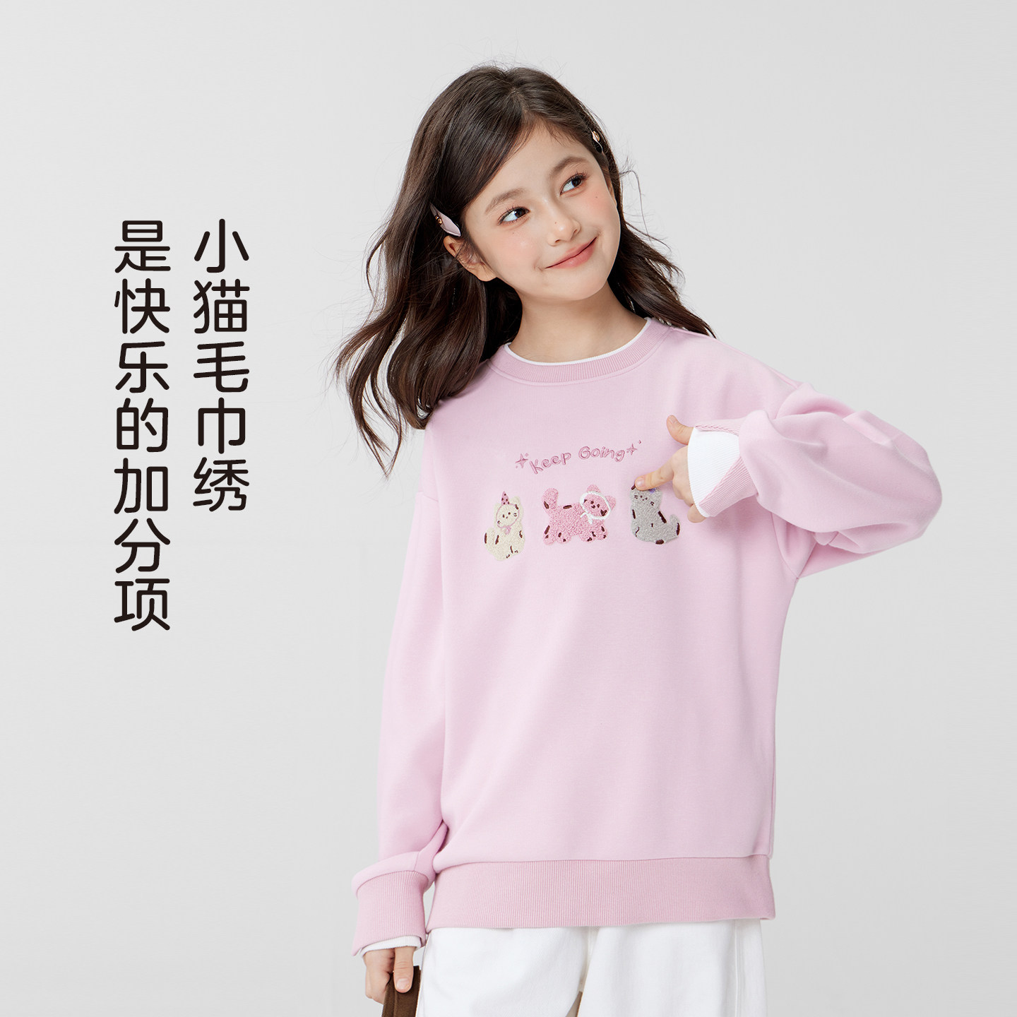 左西童装女童卫衣2026春季新品儿童假两件小猫毛巾绣圆领春装上衣