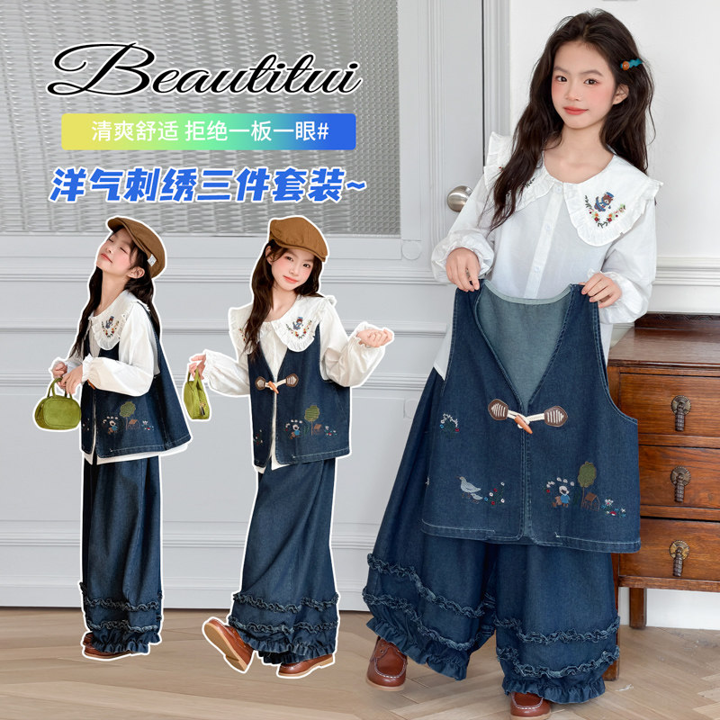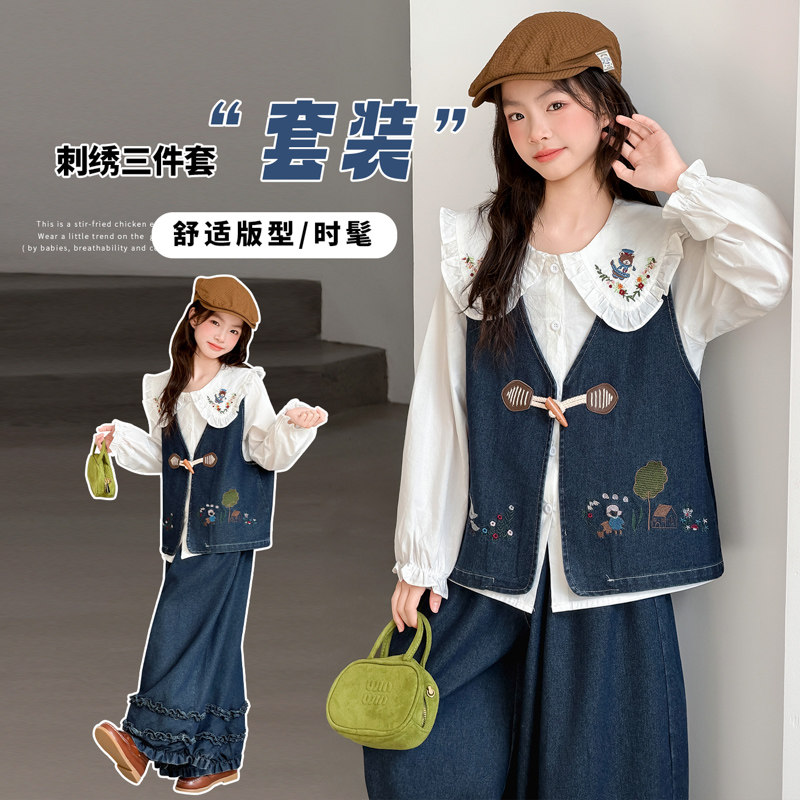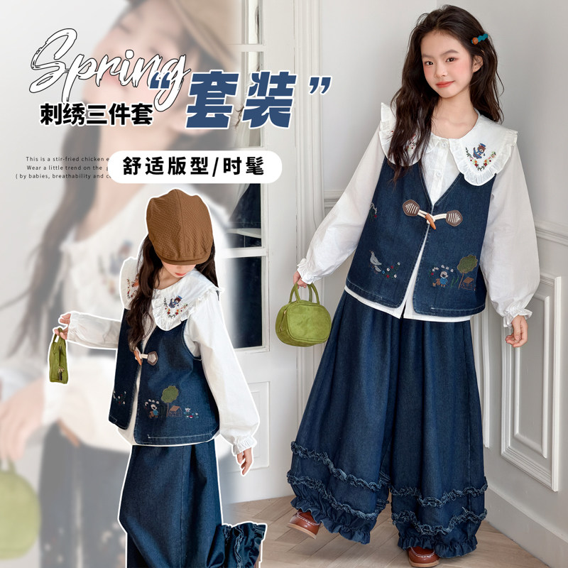 女童套装2026年新款春秋装洋气时髦中大童韩版卡通刺绣牛仔三件套