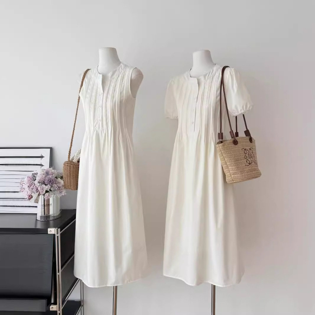 150小矮个子高级感短袖连衣裙女夏季法式无袖背心裙收腰a字中长款