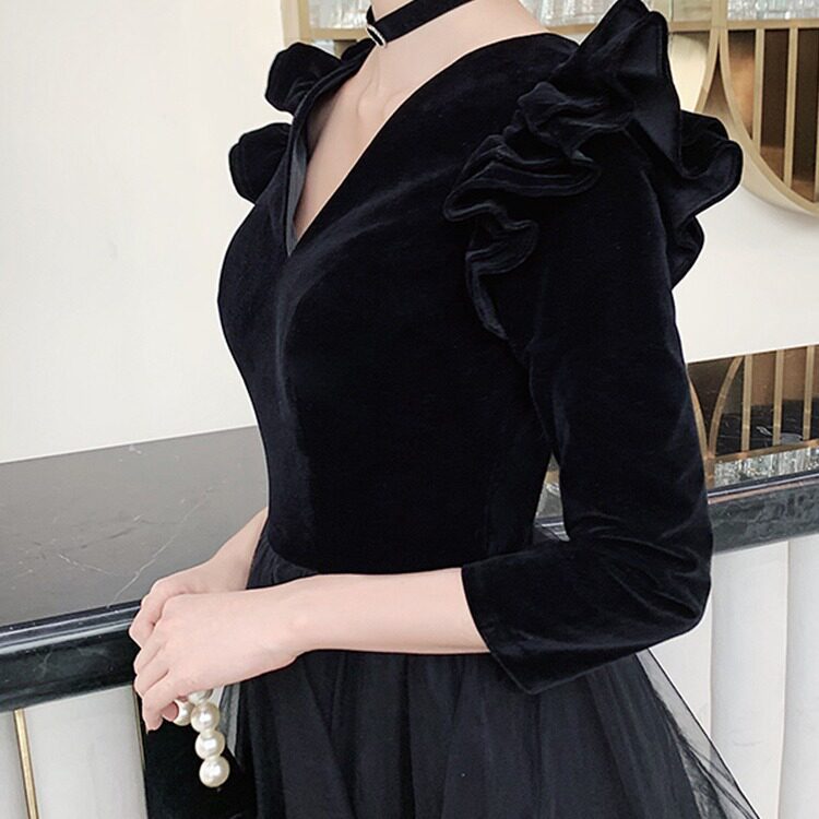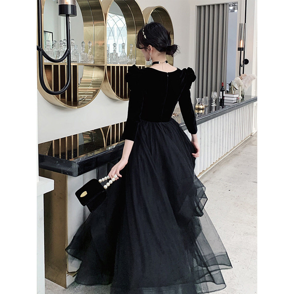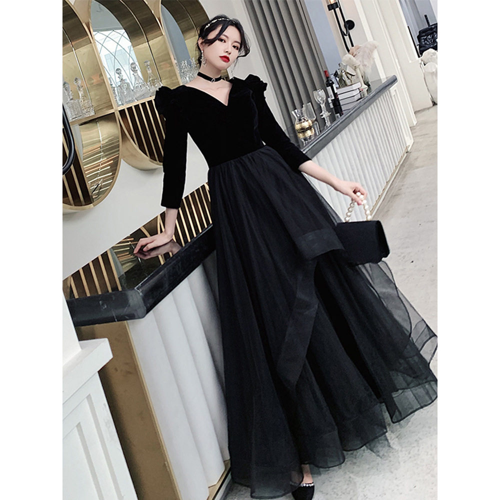 晚礼服2026新款夏季长袖气质丝绒宴会连衣裙女黑色长款年会晚礼服